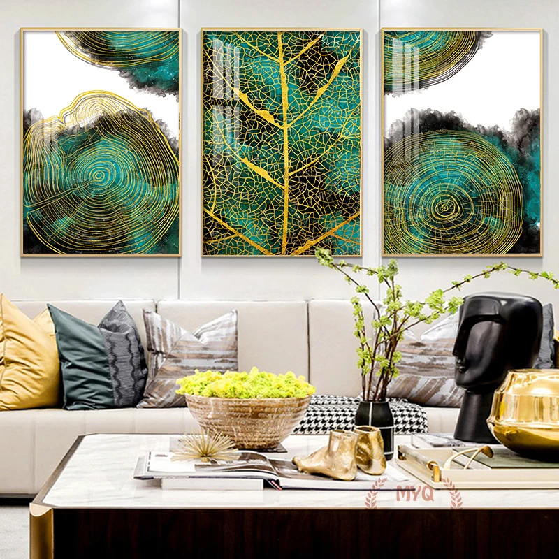 Абстрактная зеленая Золотая синяя Настенная картина золотая линия с...