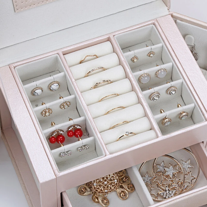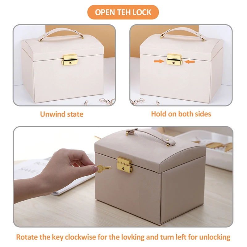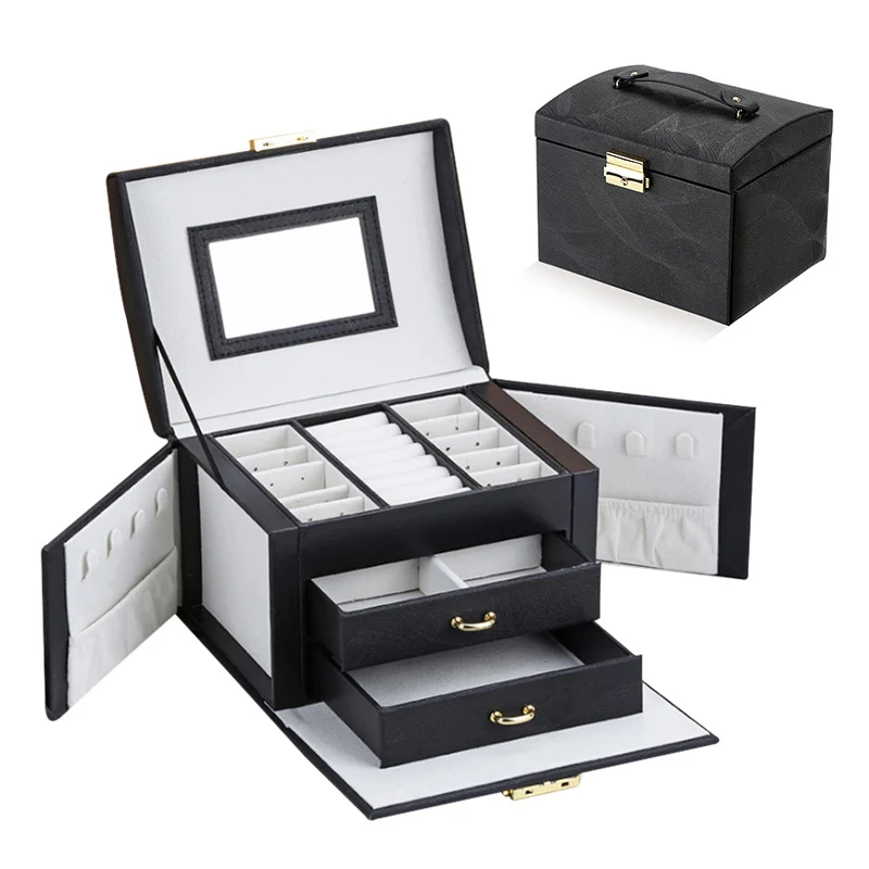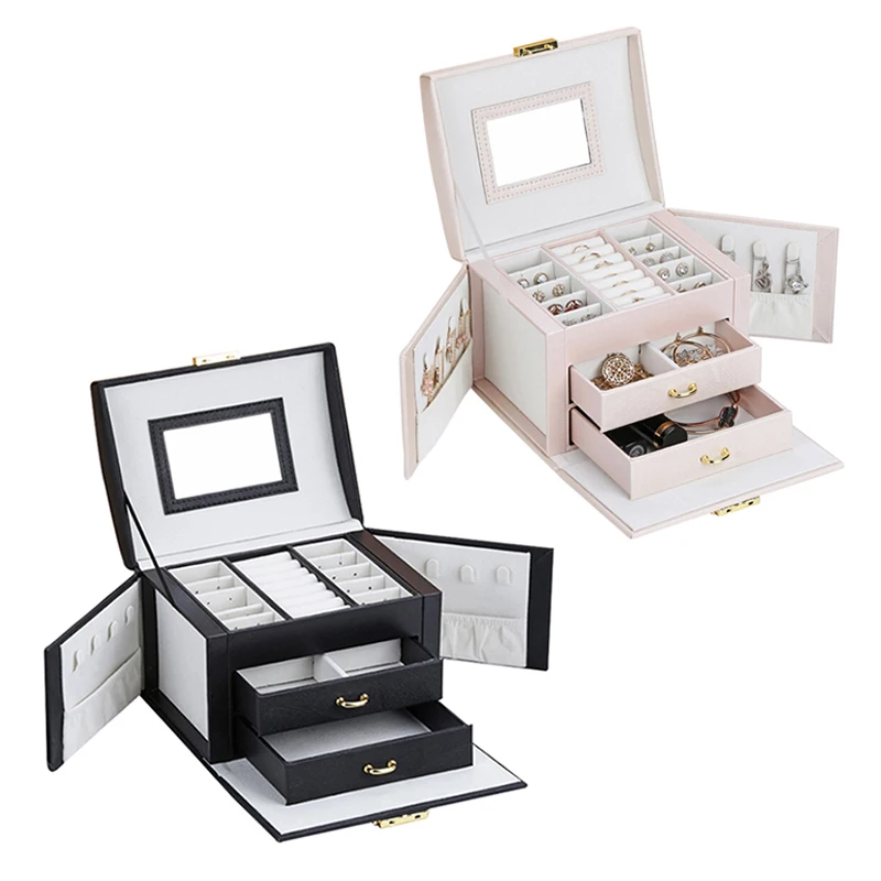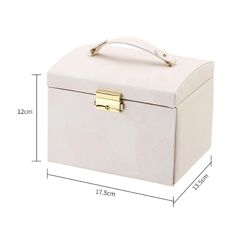 Материал: внешняя шелковая зернистая кожа, внутренняя фланель. Размер: 17,5*13,5*12 см. Характеристика: 1. Текстура прозрачная и ретро, с текстурой, долговечностью, легко организовать и очистить. 2. Внутри есть зеркало высокой четкости, что удобно и практично. 3. Паз для сережек: вмещает более 7 колец и 8 пар сережек. И его можно перемещать. 4. Ожерелье с обеих сторон легко организовать, и его больше не легко завязать. 5. Ручной дизайн и конструкция замка, удобно брать и хранить украшения.