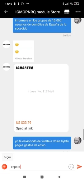 Очень осторожно! Возможная афера. Он хочет, чтобы вы заплатили больше за товары, которые вы уже заплатили. Событие: Продавец не отправляет товар правильно. Он смешал две поставки или поставил продукты, которые не те, которые я заказал в отгрузке, и не включил те, которые я заказал. При открытии спора о заказе (3 покупки одновременно) AliExpress возвращает сумму 2 напрямую, и спор трех покупок ожидается. Я купил несколько USB CC2531 и программист. Продавец не отправляет программист. Поэтому я не могу использовать любой CC2531. Увидев это, продавец начинает связываться со мной и начинает рисковать, поставив меня в черный список компании, если я не плачу ему (через странную ссылку и без продуктов) И деньги, и AliExpress вернули мне. Конечно, иметь программист, чтобы убедиться, что все работает правильно, я бы сказал AliExpress, чтобы забрать деньги, но никогда не использовать странный ссылку. Я оставляю фотографии всего