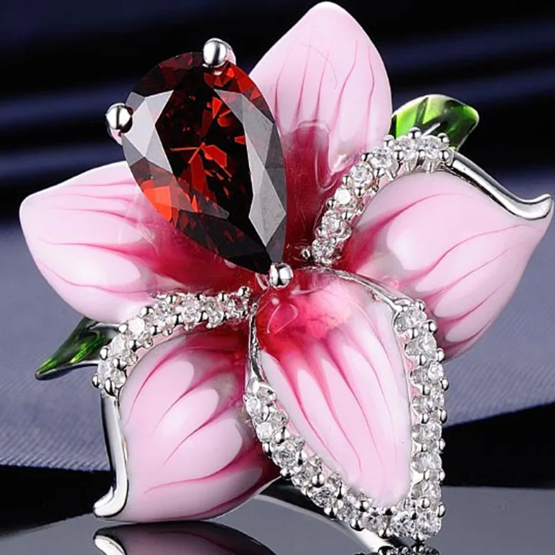 Женское кольцо с цветком и кристаллами, кольцо с красным Цирконом д...