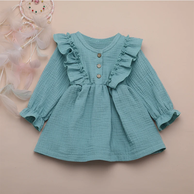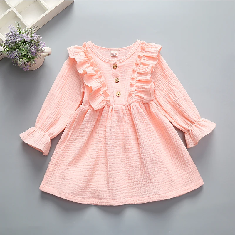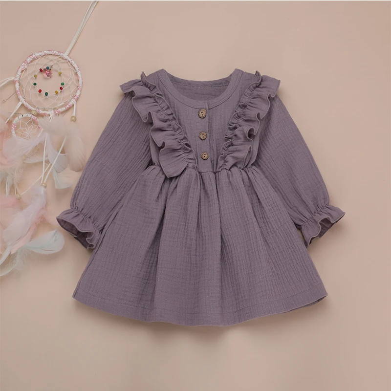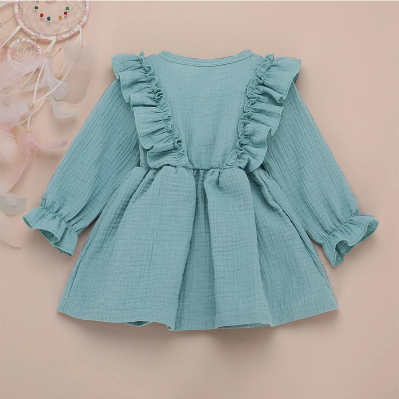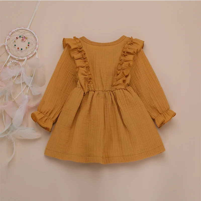 Осеннее платье для маленьких девочек, однотонное хлопковое льняное повседневное вечерние чное платье с оборками и длинными рукавами
