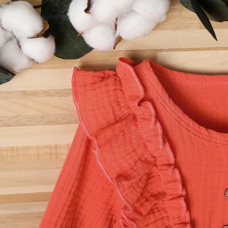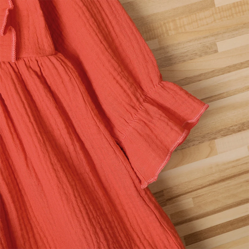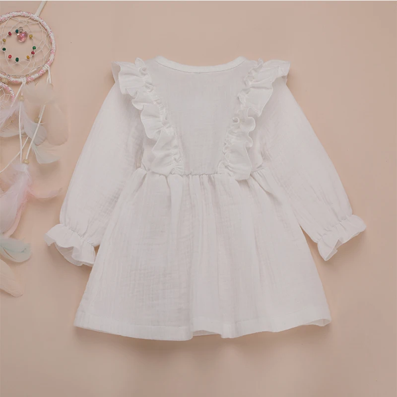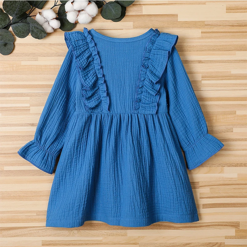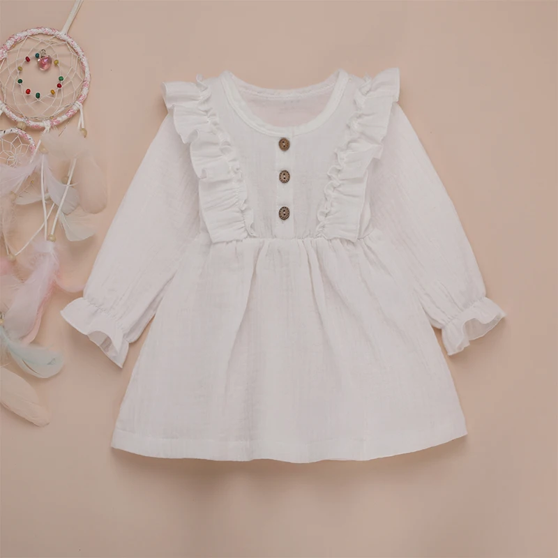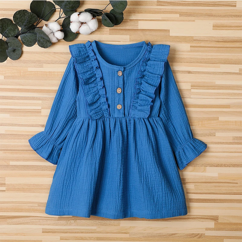 Осеннее платье для маленьких девочек, однотонное хлопковое льняное повседневное вечерние чное платье с оборками и длинными рукавами