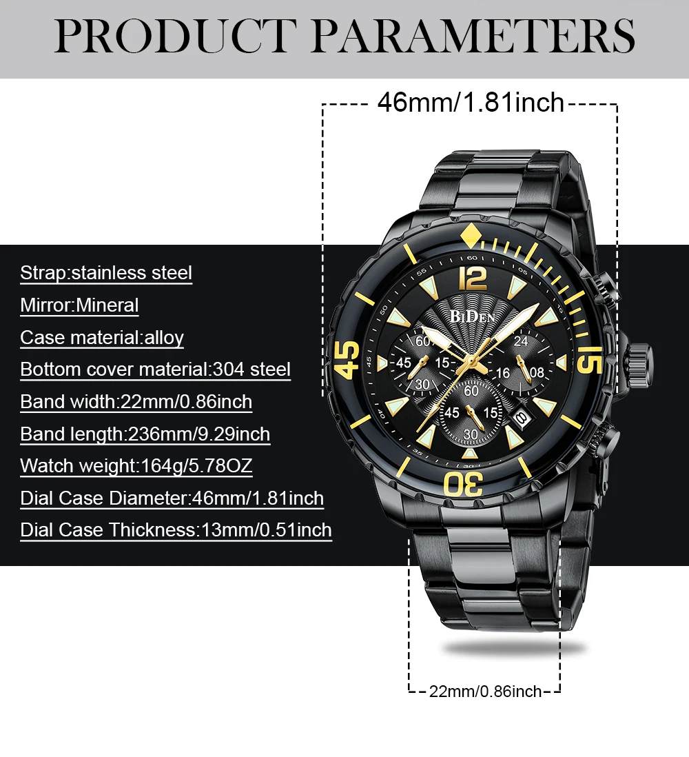Модные королевские кварцевые часы BIDENБренд: Biden 0268Стиль: Модный, Повседневный, деловой, роскошный, спортивныйОсновная особенность:1. Креативный дизайн часов, лучший бренд класса люкс.2. Классические часы с ремешком из нержавеющей стали.3. Гарантия на 12 месяцевПодходящий повод:Идеально подходит для всех случаев и мероприятий: вечерние, юбилейные, деловые, повседневные, спортивные, домашние или повседневныеХарактеристики:-Диаметр циферблата: 46 мм-Чехол Толщина: 13 мм-Длина ремешка: 236 мм-Ширина ремешка: 22 мм-Вес: 164 г-Часовой механизм: кварцевый (требуется батарея)-Материал зеркала: Hardlex-Тип застежки: складная застежка с безопасной-Функция: календарь; Хронограф; Светящиеся стрелки-Водонепроницаемость: Водонепроницаемость (не для плавания или душа)Посылка включает в себя:Часы-1 шт. (подарочные коробки на выбор)