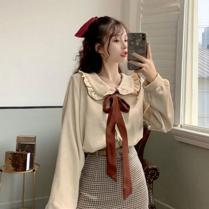 Рубашка женская Винтажная с воротником Питер Пэн, блузка оверсайз с бантом в стиле ретро, универсальный топ для девушек в колледже, весна-осень