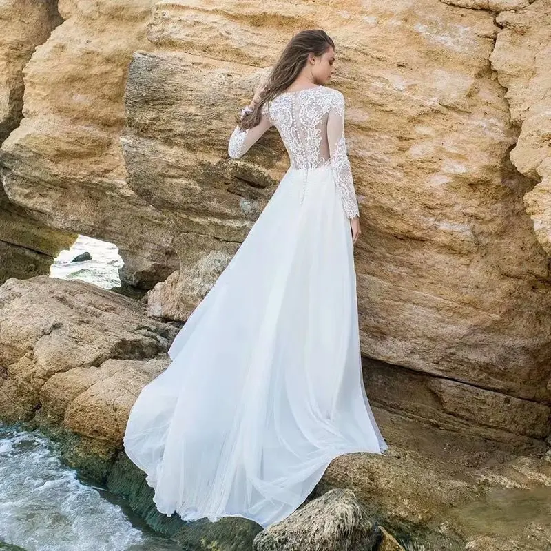 Женское свадебное платье в стиле бохо, кружевное свадебное платье с круглым вырезом и длинными рукавами