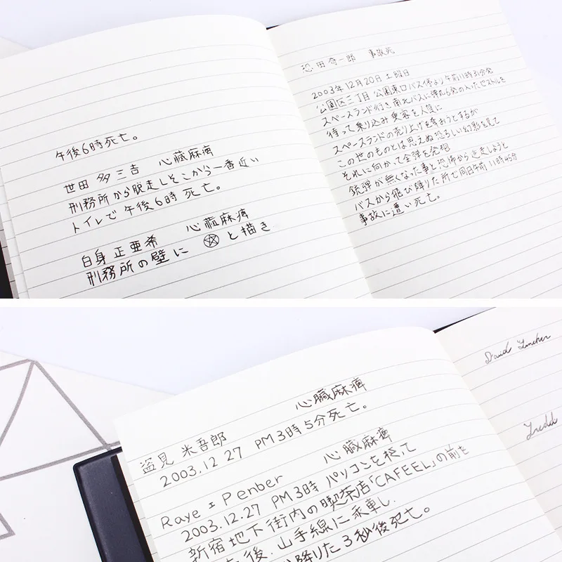 Название: Записная книжка Death Note100% новый и высокое качествоРазмер: 20,7*14,7 смМатериал чехла: кожаный чехол из ПВХБумага: 74 листа (148 страниц)Упаковка: 1 ноутбук (opp bag) и 1 перо (подарок)Содержание ноутбука:1 Лист Прозрачной серебряной бумаги30 штук черной бумаги с персонажами7 листов пустой бумаги с символами37 белых бумаг