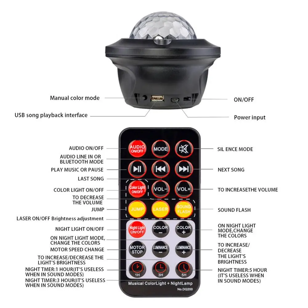 * 3. Пульт дистанционного управления: оснащен пультом дистанционного управления, вы можете легко регулировать яркость, скорость вращения, Режимы освещения, таймер и переключать песни.