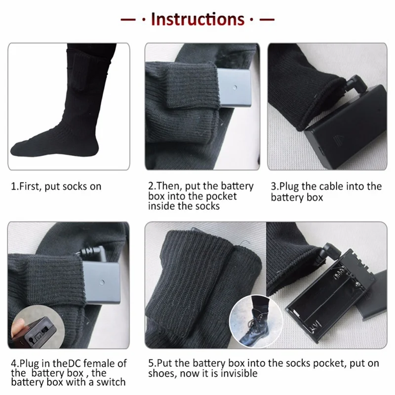 Характеристика: 1. Перезаряжаемые носки с подогревом --- перезаряжаемые носки с подогревом-идеальное сочетание качества, надежности и комфорта. Носки с подогревом являются важной частью нашего здоровья ног, так как они сохраняют тепло и комфорт в холодную погоду. Но не только пара носков. Эти носки с подогревом обеспечивают тепло в течение нескольких часов при зарядке от аккумулятора. 2. Легкие и удобные --- тонкие и легкие нагревательные панели. Носки с подогревом оснащены легкими и ненавязчивыми нагревательными элементами, которые сохраняют работу в течение нескольких часов, гарантируя, что вы будете в тепле и уюте в самые Детские дни 3. Применение --- носки с электрическим подогревом сохраняют тепло и комфорт в течение всего дня, идеально подходят для пеших прогулок, охоты, ледовой рыбалки, активного отдыха в холодную погоду. Зимой больше не будет холодных ног. 4. Лучшие теплые носки для ног --- зимние теплые носки хорошо подходят для кровообращения, согревают весь корпус. Носки с электрическим подогревом аккумуляторной батареи. Лучшая грелка для ног в холодные дни. 5. Идеальный подарок --- служит теплым подарком для ваших родителей и друзей, это лучший выбор, чтобы ваши ноги были теплыми в суровую зиму. 6. Поставляется с 2 батарейными отсеками 3 В постоянного тока и согревает пальцы ног и заднюю часть ваших ног, а также с температурой нагрева около-50 градусов Спецификация: Тип батареи: AA батарея Материал: смесь хлопка Сезон: зима Разделение пальцев: нет Размер: один размер Подошва носков: 21-30 см Носки без пятки: 24-37 см Температура нагрева: около 50 градусов Упаковка: Opp мешок Примечание: Из-за разницы в экране цвет может немного отличаться от того, что вы ожидаете, пожалуйста, позвольте Упаковка включает: 1 пара носков