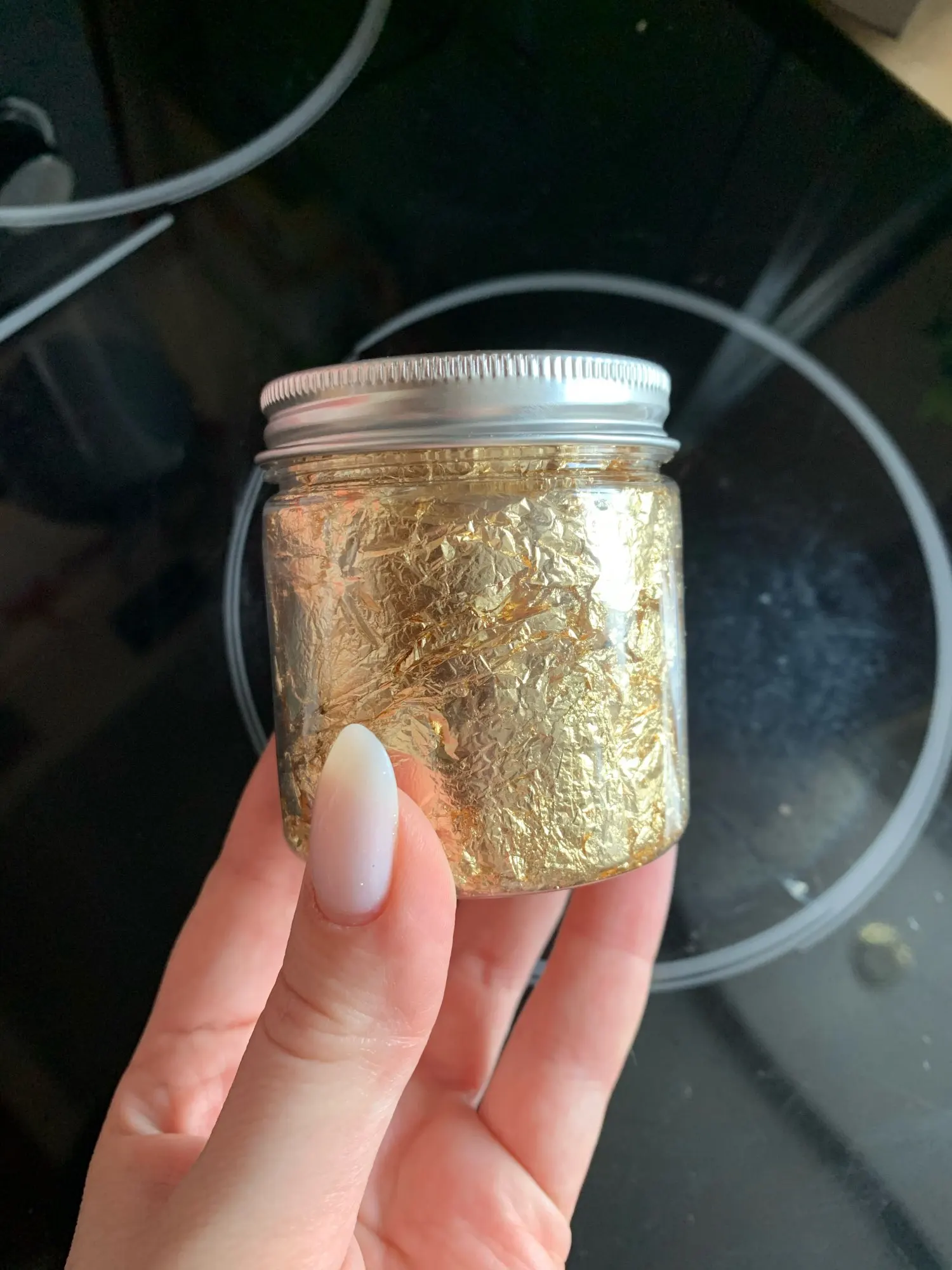 ПРОДАВЕЦ ОТЛИЧНЫЙ. Шло до Хабаровска в сборной посылке месяц, изначальный трек неотслеживающийся, упаковано в пупырку, банка пластиковая. ХРЕН ЗНАЕТ ЧТО ЭТО ТАКОЕ - досталось за 13 рублей, брал чтобы добрать до купона АлиЭкспресс. Я так понимаю это для дизайна ногтей, но возможно приспособлю для декора, например, картин или чего-то подобного, может получиться симпатично ( надо, видимо, лаком покрывать, думаю можно строительным ). Объем баночки - 100 мл