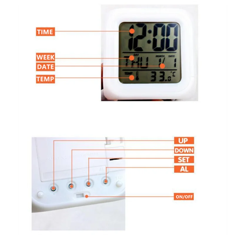 Светодиодный светильник с разными цветами. Поддержка 12-часовой и 24-часовой формат времени, календарь, температуры и сигналу тревоги при сбое. Функция будильника и сна Семицветный светильник, создающий романтическую атмосферу. Большой светодиодный цифровой дисплей, с первого взгляда. Многофункциональность: время, будильник, год, месяц, день, неделя и функция отображения температуры. Два температурных стандарта: температура Цельсия (0 ℃ -55 ℃) и китайский (32 ℉ -122 ℉) дисплей на выбор. Использование LDE светильник, экономия энергии.Характеристики: