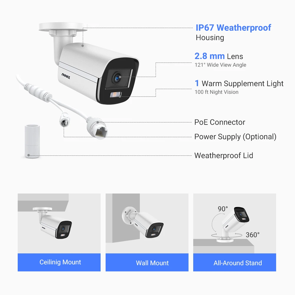 ANNKE 1 шт.4 шт. ультра полноцветная 4-мегапиксельная IP-камера POE IP67 водонепроницаемая сетевая цилиндрическая камера наблюдения ночного видения Электронная почта оповещения металлическая камера