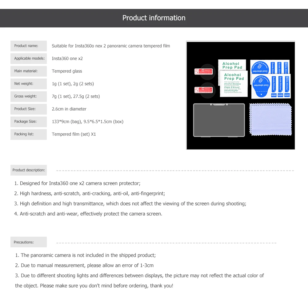 Высокопрочная прозрачная защитная пленка из закаленного стекла для камеры Insta360 ONE X2Характеристика:1. Предназначен для Insta360 ONE X2;2. Высокая твердость, Анти-Царапины, анти-растрескивание, анти-масло, анти-отпечатков пальцев;3. Высокая четкость и высокая пропускаемость, не влияет на просмотр экрана во время съемки;4. Защита от царапин и износа, эффективно защищает экран камеры.Спецификация:Подходящая модель: для Insta360 ONE X2Материал: закаленное стеклоЦвет: прозрачныйВес нетто: 1 г (1 шт.), 2 г (2 шт.) (опционально)Вес брутто: 7 г (1 шт.), 27,5 г (2 шт.) (опционально)Размер изделия: диаметр 2,6 см/1,02"Размер упаковки: 13,3*9 см/5,24*3,54 "(сумка), 9,5*6,5*1,5 см/3,74*2,56*0,59" (коробка)Примечание:1. Возможны незначительные отклонения в размере из-за ручного измерения, различных методов измерения и инструментов.2. Изображение может не отражать фактический цвет изделия из-за различных фотографирования светильник, угол и дисплей монитора.