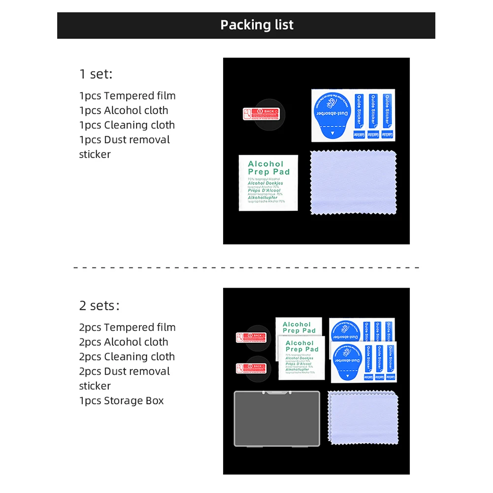 1/2 X защита экрана (не включая камеру)1/2 х спиртовые подготовительные прокладки1/2 х чистящие салфетки1/2 х наклейки для удаления пыли1 х коробка для хранения