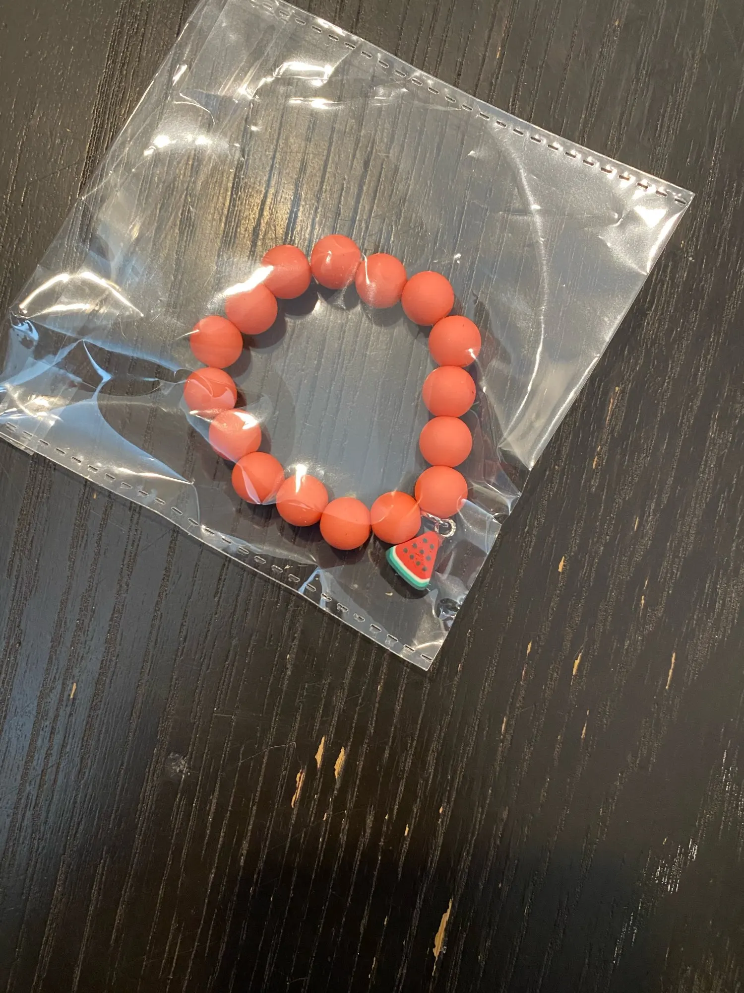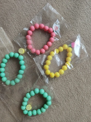Очень маленький браслет, на младенца с непухлой ручкой. Фруктик резиновый и сильно пахнет, держится на остром гвоздик, для малышей может быть опасно - сразу убрали, оставили только бусины.