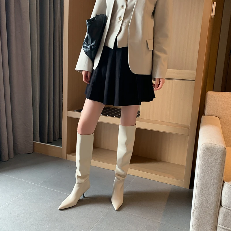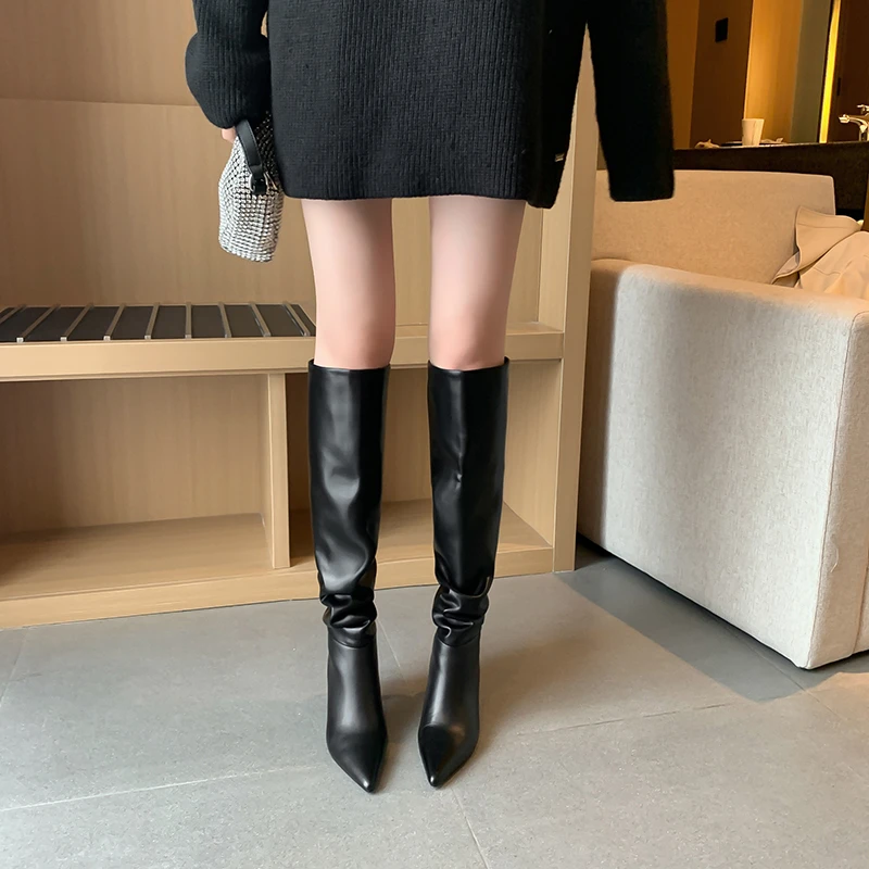 Phoentin 2021 вечерние шикарные сапоги высотой до колена женские Одежда высшего качества из натуральной кожи с острым носком в сдержанном стиле, на высоком каблуке; Обувь; Большие размеры 34-43 FT1327