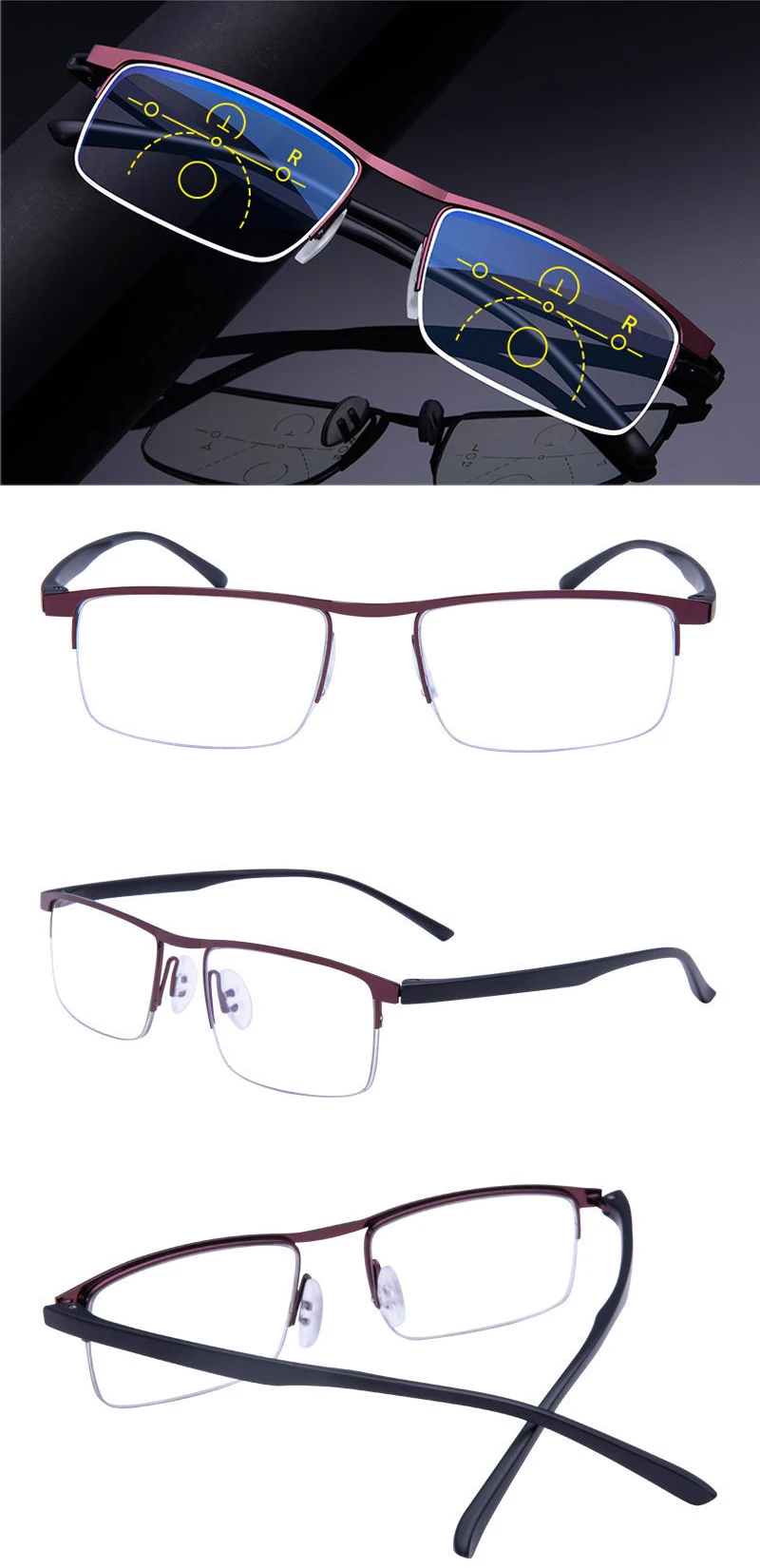 Прогрессивные многофокальные очки для чтения с полуободковой оправо...