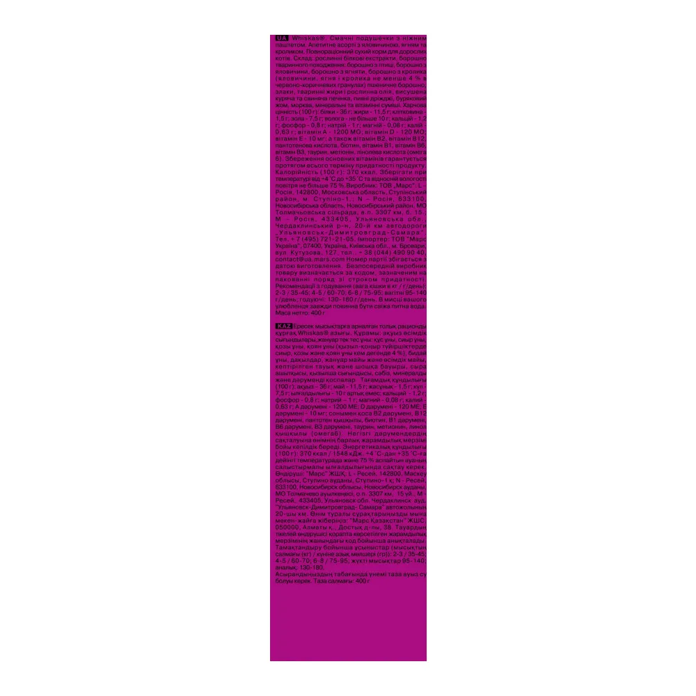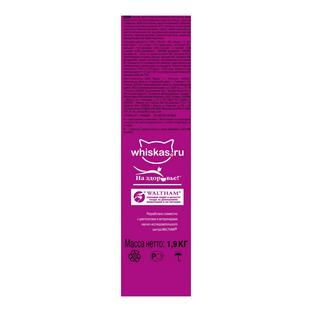 Whiskas с говядиной и вкусными подушечками - Whiskas для стерилизованных кошек со вкусом говядины - это сбалансированный рацион, который содержит специальный минеральный комплекс, необходимый для здоровья мочевыводящей системы Вашей любимицы. Состав: пшеничная мука, мука животного происхождения. В том числе мука из говядины минимум 4% в коричневых гранулахбелковые растительные экстракты, рис, животные жиры, растительное масло, высушеная куриная и свиная печень, пивные дрожжи, витамины и минеральные вещества. Рекомендации по кормлению: Дневные нормы кормления (сухой корм) 2-3 кг - 35-45 гр корма 150 ккал 4-5 кг - 55-65 гр корма 225 ккал 6-8 кг - 75-95 гр корма 310 ккал