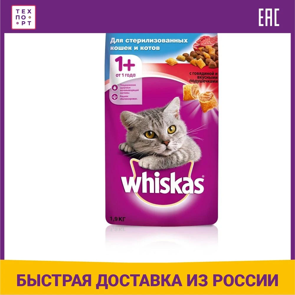 Сухой корм Whiskas с говядиной и вкусными подушечками для стерилизованных кошек 1,9кг (10139180)