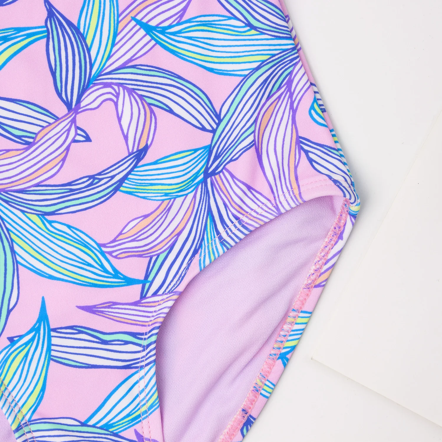 Детский цельный купальник для девочек, с принтом листьев, летний пл...