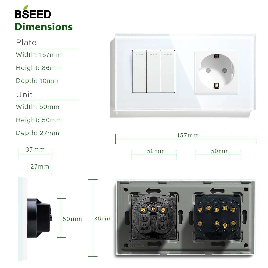 BSEED 3 банды 1 способ 2 способ ЕС стандартный кнопочный переключатель с розетками вилка Хрустальная стеклянная панель 3 цвета для дома