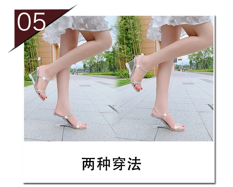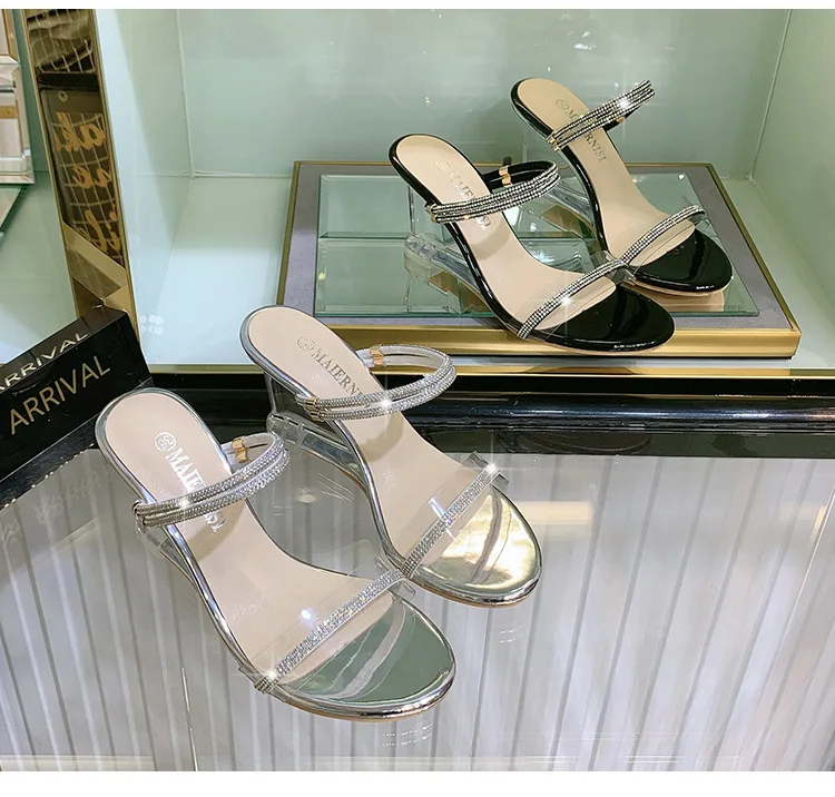 Женские прозрачные шлепанцы на танкетке, сандалии с открытым носком, высокий каблук с кристаллами, сланцы, пикантные, серебристые, черные, на лето