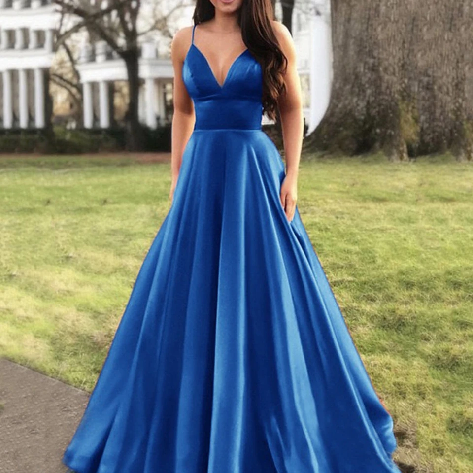 Ярко-голубое платье в пол с V-образным вырезом и открытыми плечами