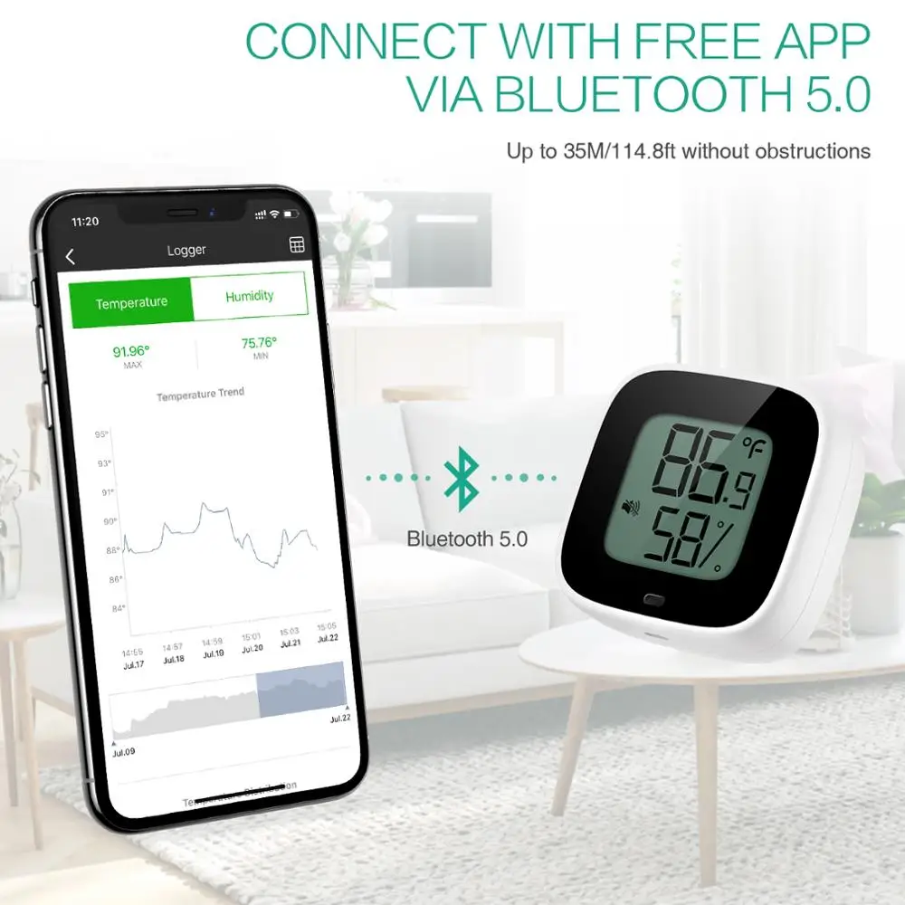 【Bluetooth беспроводное подключение 】 Используйте чип Bluetooth 5,0. Легко контролировать температуру и влажность данных в приложении Sensor Blue (Бесплатная загрузка из App Store или Google Play) через Bluetooth.