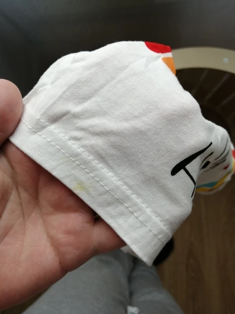 Комплект очень тонкий, торчат нитки. На футболке этикетка пришита на лицевой стороне.