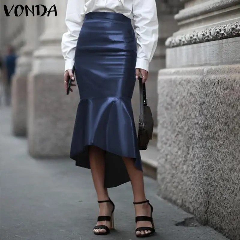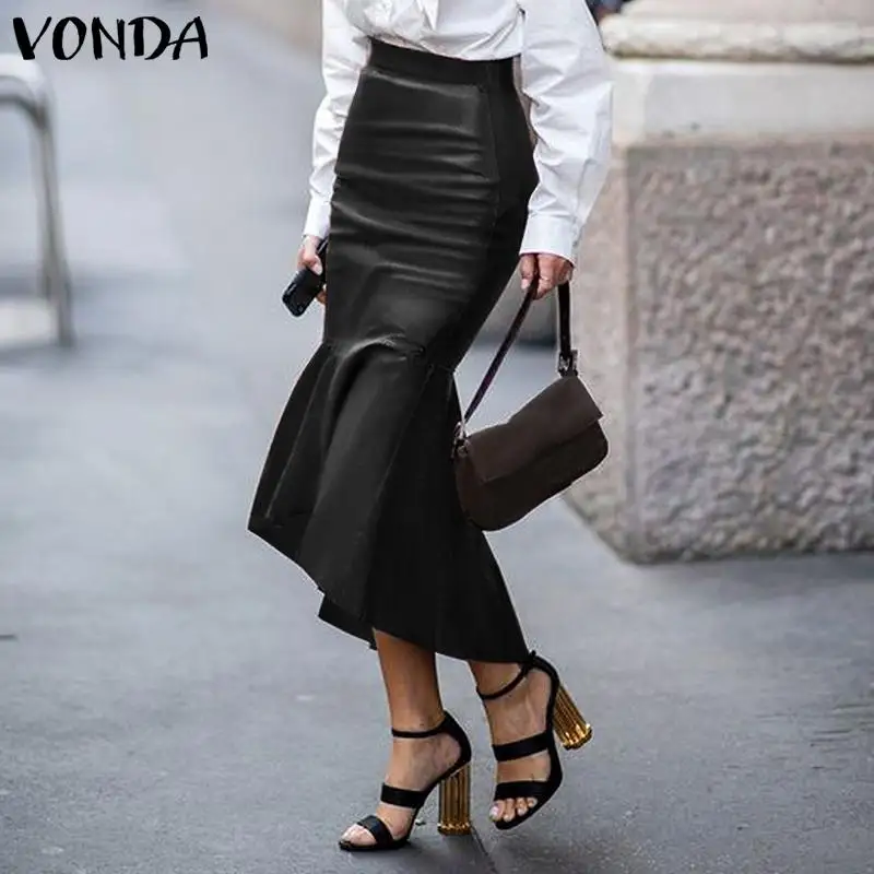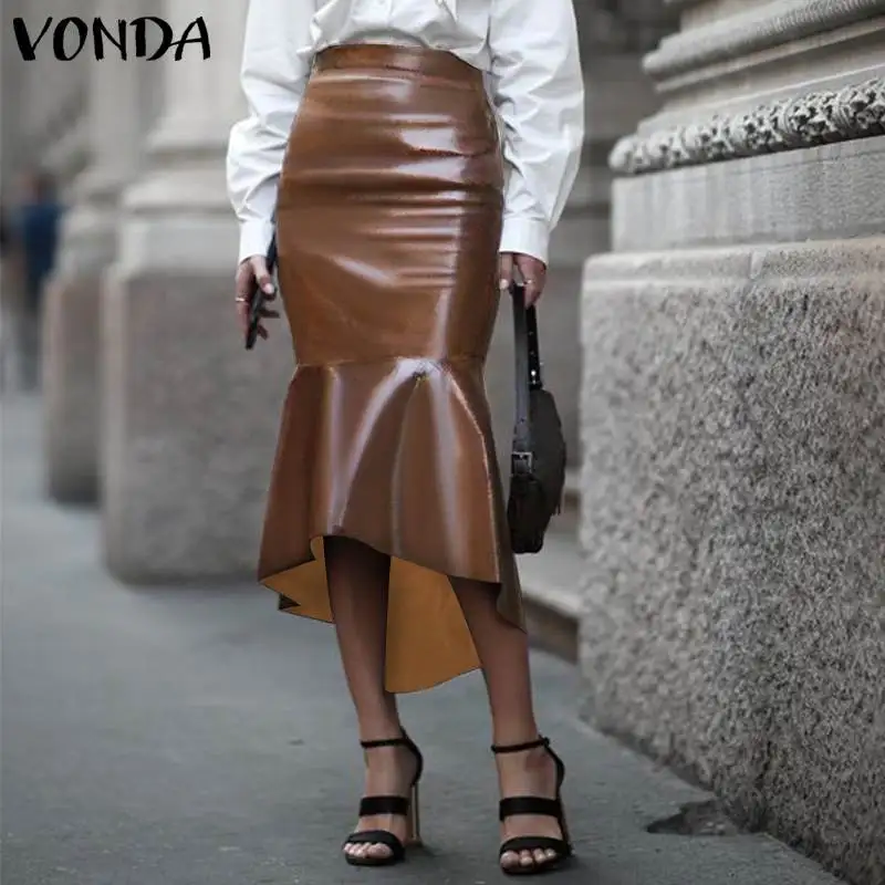 Элегантная женская юбка из искусственной кожи 2021 VONDA Сексуальная асимметривечерние вечерняя юбка с высокой талией бедра длинные юбки Mujer