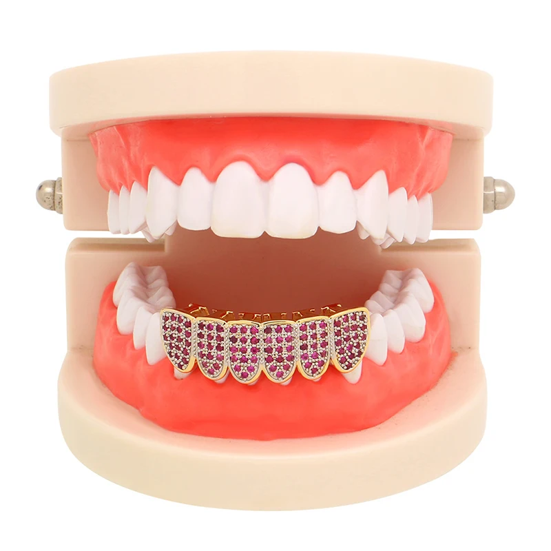 Полный льдом из кубического циркония, декоративные Зубные коронки розовый цвет стразызубные шапки зубы грили верхней и нижней набор, реперские кепки вечерние ювелирные изделия