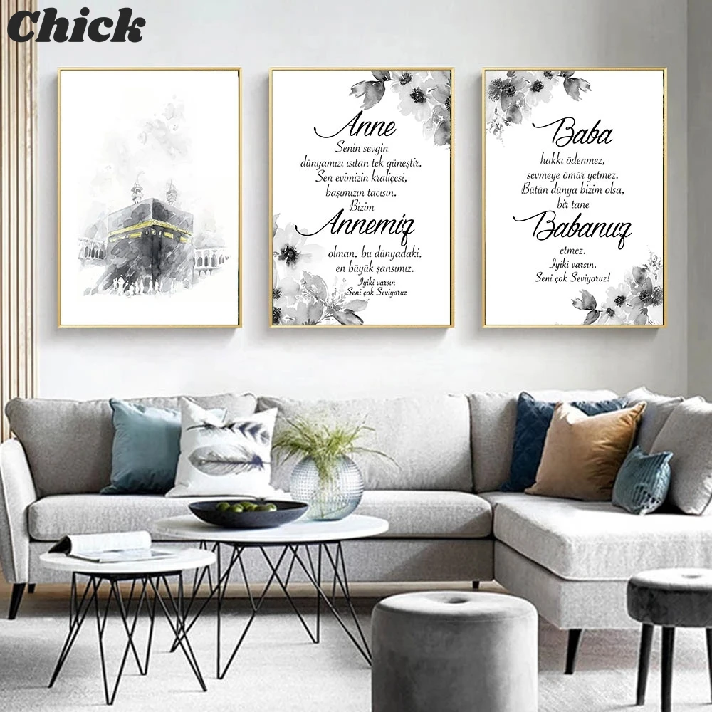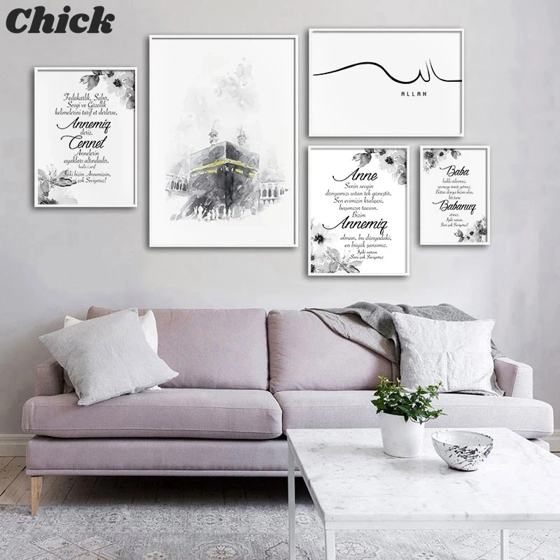 Черно-белая Исламская цитата, холст, живопись, арабская каллиграфия, Постер Кааба Аллах, настенная печать, мусульманский Декор для дома, картина