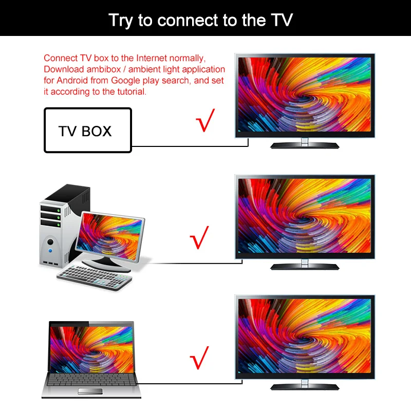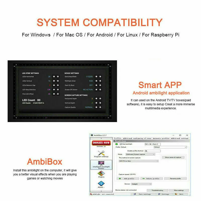 Настройка программного обеспечения Ambibox Capture.Шаг 1: Установите светодиодный светильник на вашем ПК. (Пожалуйста, обратитесь к видео для получения подробной информации, свяжитесь с нами, чтобы отправить вам ссылку видео)Шаг 2: Настройка программного обеспечения Ambibox Capture.2,1. Программное обеспечение Ambibox (Shareware);2,2. Запуск программного обеспечения Ambibox, при установке, рекомендуется использовать PlayClaw, я не рекомендую использовать его.2,3. Выберите устройство и установите его как «Adalight», в меню «Интеллектуальный дисплей подсветки» выберите порт и com-порт, который был обнаружен вашим устройством. Если вы не уверены, посмотрите в менеджере устройств. Если выбрать правильно, вы можете увидеть состояние устройства: подключено, также внизу слева будет сказано, что Adalight: подключено.(Примечание: usb-порт должен быть CH340(COM *), если нет, пожалуйста, загрузите драйвер CH340 :)2,4. Здесь вы также можете выбрать способ захвата, который я предлагаю GDI FS Aero или PlayClaw. Теперь под количеством зон выберите номер IC, который у вас есть, и это будет один IC для каждого светодиодный.После установки вы можете выбрать «Зоны Захвата мастера», которая автоматически генерирует все Зоны Захвата для вас.Здесь вы также можете выбрать способ захвата, который я предлагаю GDI FS Aero или PlayClaw. Теперь под количеством зон выберите номер IC, который у вас есть, и это будет один IC для каждого светодиодный.Сохраните свои настройки и теперь вы должны быть в состоянии дать ему тест!Примечание:Светодиодная лента работает только после установки и настройки.× Если просто подключить к источнику питания и USB, он не работает!Советы: Если вы обнаружите, что ваши цвета стираются или кажутся очень белыми, а не красочными, настройте настройки гамма, если вы получаете белую подсветку на чистом черном экране, увеличьте размер зон образцов, это займет немного тонкой настройки, но стоит того!Хорошо сделано!Недостатки программыНе перекрестная платформаПри использовании первых 6 встроенных методов захвата необходимо отключить Aero в Windows Vista и Windows 7, в противном случае Windows отключит Aero.Не работает soundlights в Windows XP.Пожалуйста, попробуйте и наслаждайтесь.