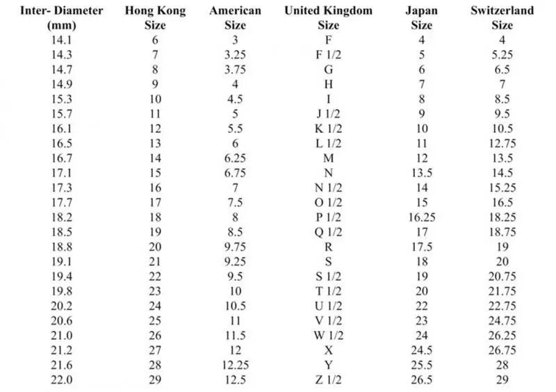 Размер кольца соответствует 4 стандартам размеров: США, Великобритания, ЕС, Япония.