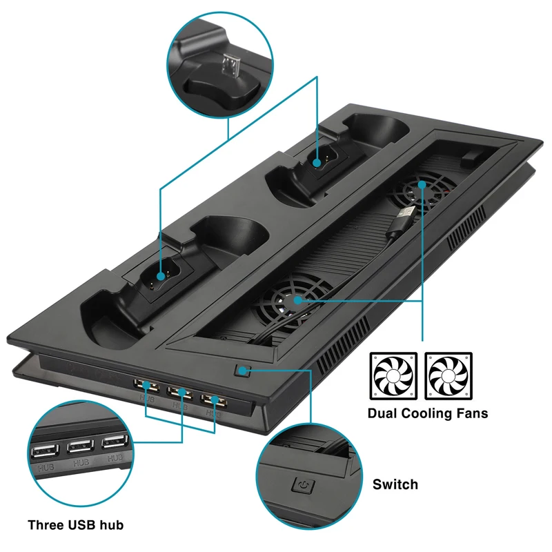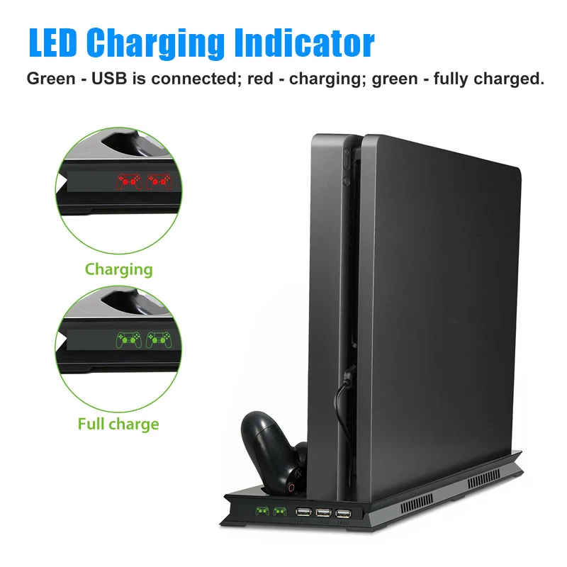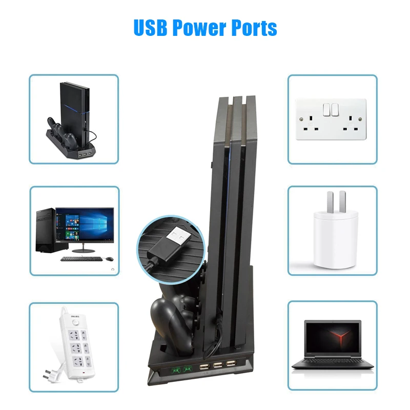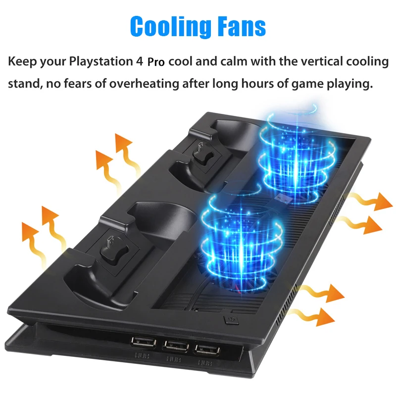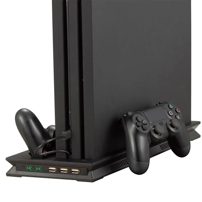 Характеристика:Все-в-одном-Цоколь:Многофункциональная вертикальная подставка для консоли PS4 Pro + охлаждающая док-станция для игровой консоли, зарядная станция dualshock 4 контроллера и 3 дополнительных концентратора.