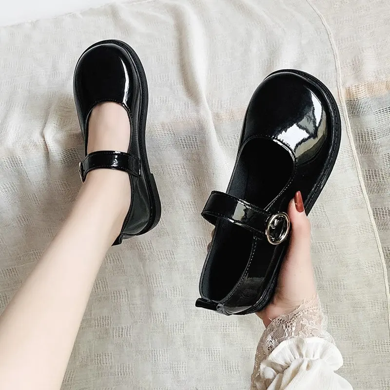 Женские весенние Черные Туфли Мэри Джейн на плоской подошве туфли Лолиты из лакированной кожи обувь для девочек с круглым носком женская обувь с круглым ремешком и пряжкой 8896N