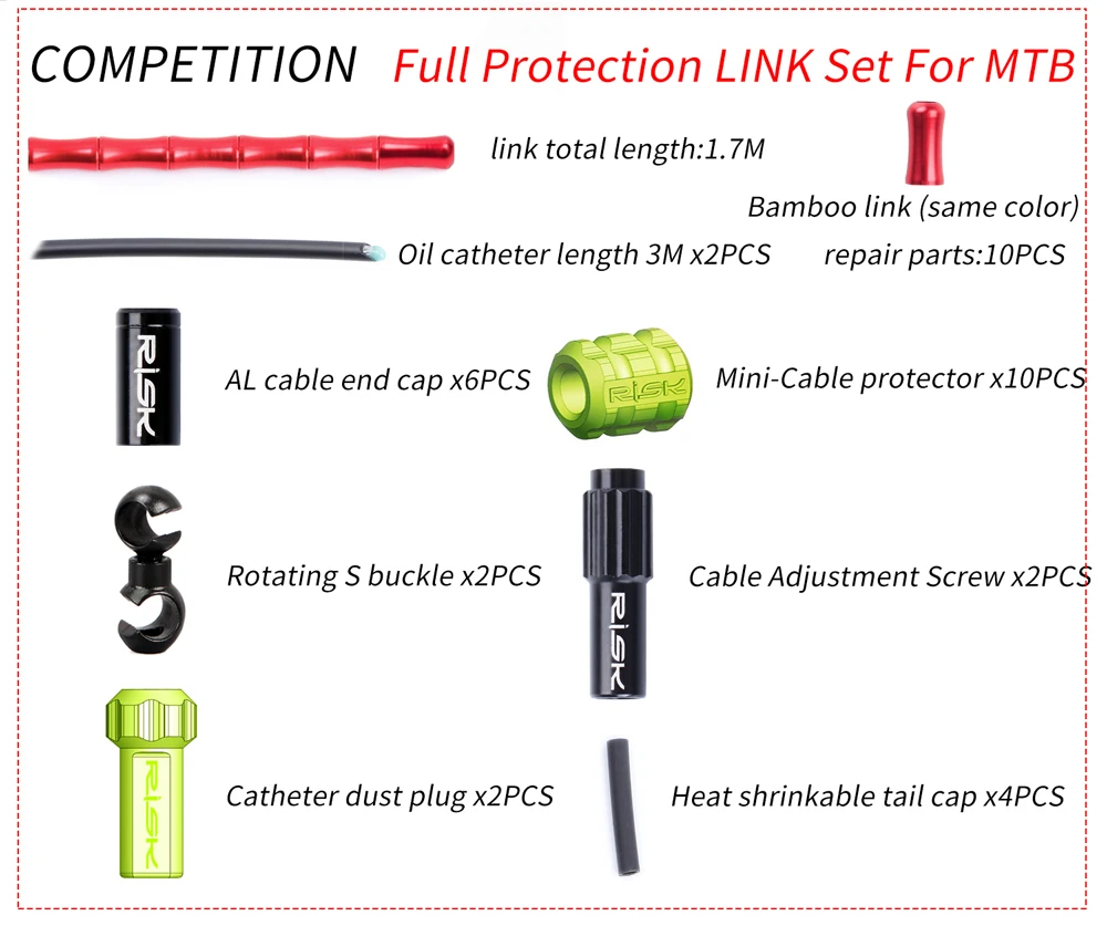 Полная защита соревнований-набор звеньев для списка MTBСсылка Общая длина: 1,7 мБамбуковые детали для ремонта одного цвета: 10 шт.Длина масляного катетера 3 м * 2 штКонцевая крышка кабеля из алюминиевого сплава: 6 шт.Протектор мини-кабеля (светящаяся версия):10 шт.Вращающаяся s-образная Пряжка * 2 шт.Кабель переключения тонкой поворота винт * 2Пылезащитная заглушка катетера (светящаяся версия):2 шт.Термоусадочная внутренняя Хвостовая крышка * 4 шт
