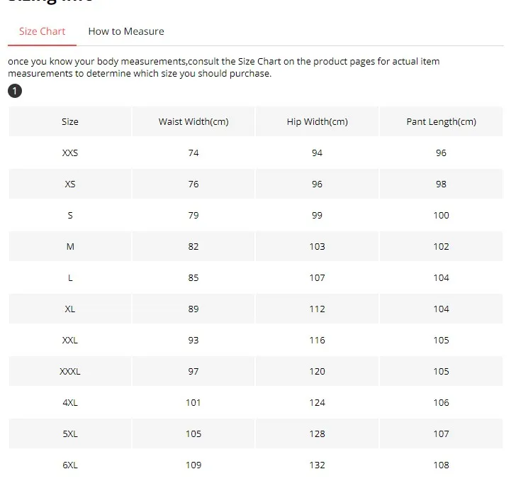 Пожалуйста, выберите подходящий размер брюк из этой таблицы размеров.