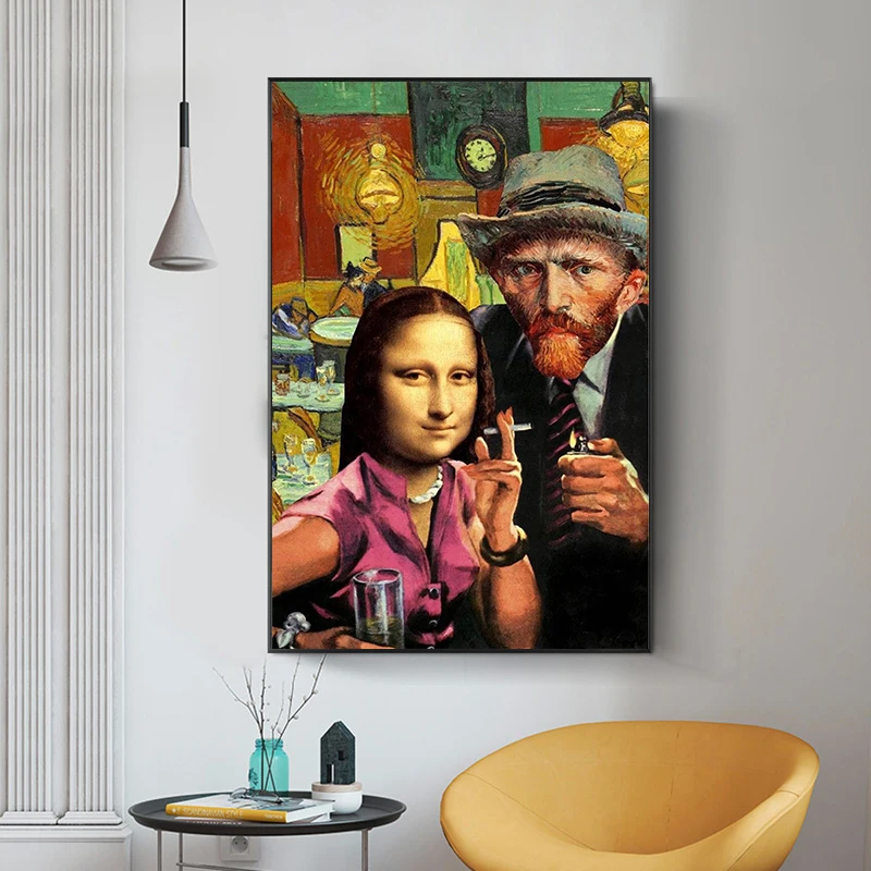 Забавное искусство Мона Лиза и Ван Гог курение холст картины стены художественные плакаты и принты да Винчи знаменитые картины для гостиной