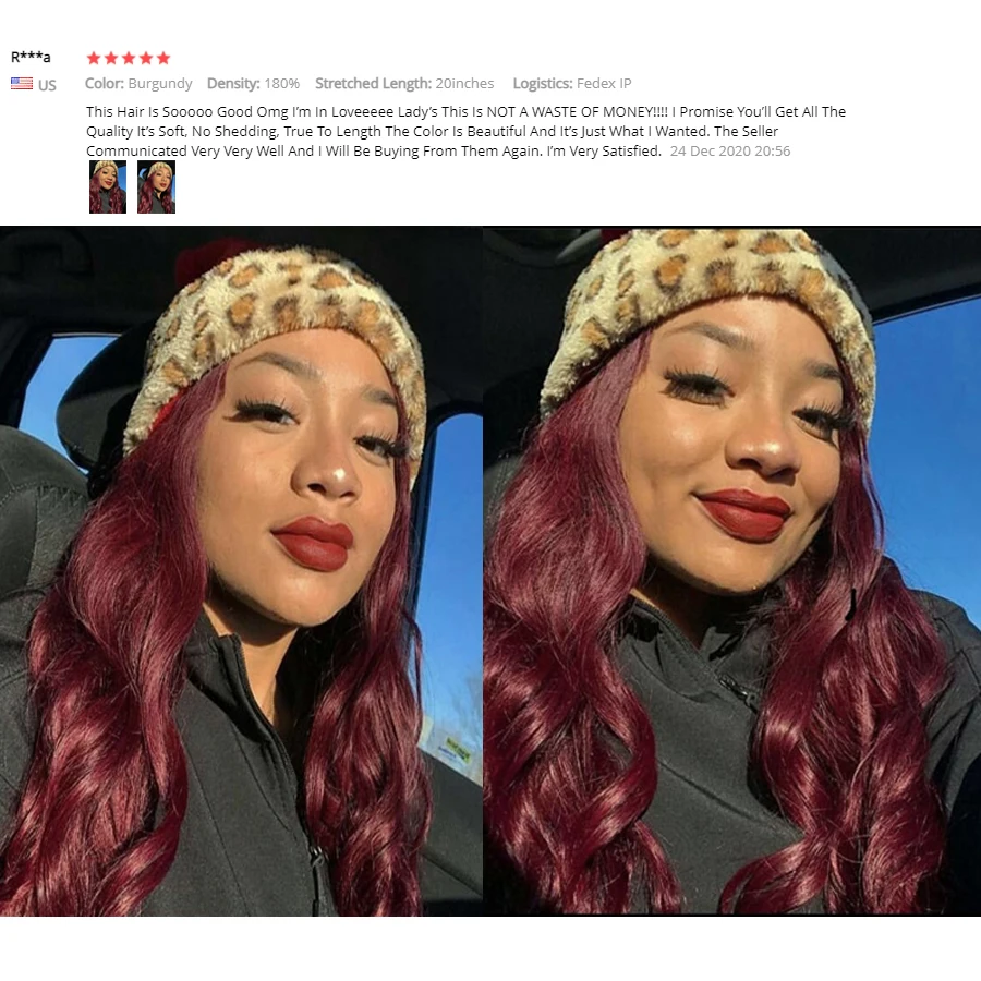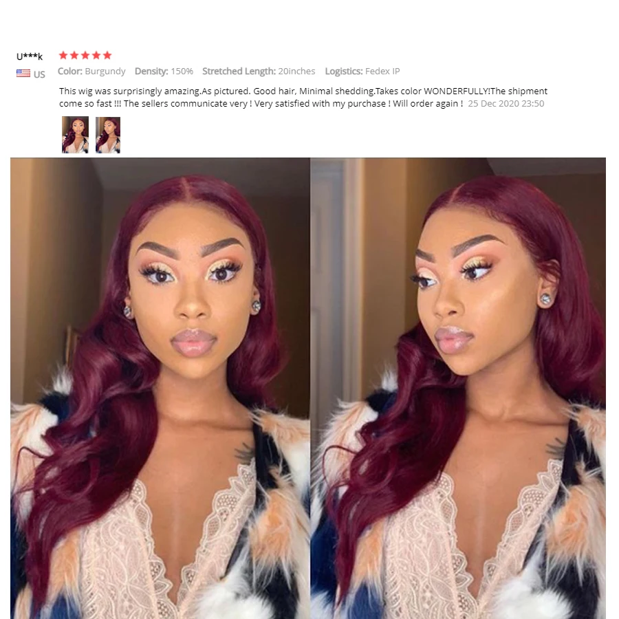 1. Объемная волна, мягкая и натуральная волосяная линия с детскими волосами. Парики из 100% человеческих волос2. Кружево, цвет бордовый 99J3. Окружность 22,5 дюймов растягивается средний колпачок с регулируемыми бретелями и 4 расчески, который может быть отрегулировано по фиксированном положении для разных размеров головы4. Идеально подходит для повседневной жизни, Хэллоуина, концертов, свадьбы, свиданий, тематических вечеринок, косплея и любого другого случая, и приносит вам больше уверенности и очарования.5. Высокое качество. Он может быть стилизован с помощью тепловых инструментов.
