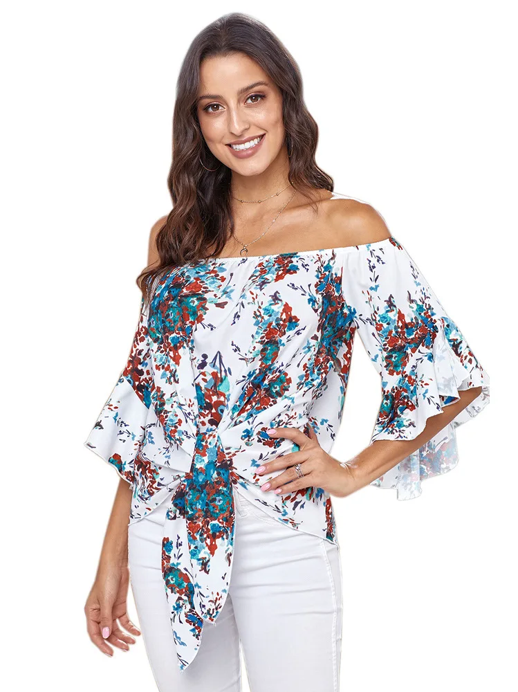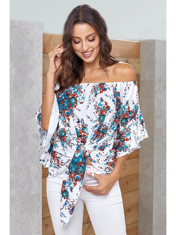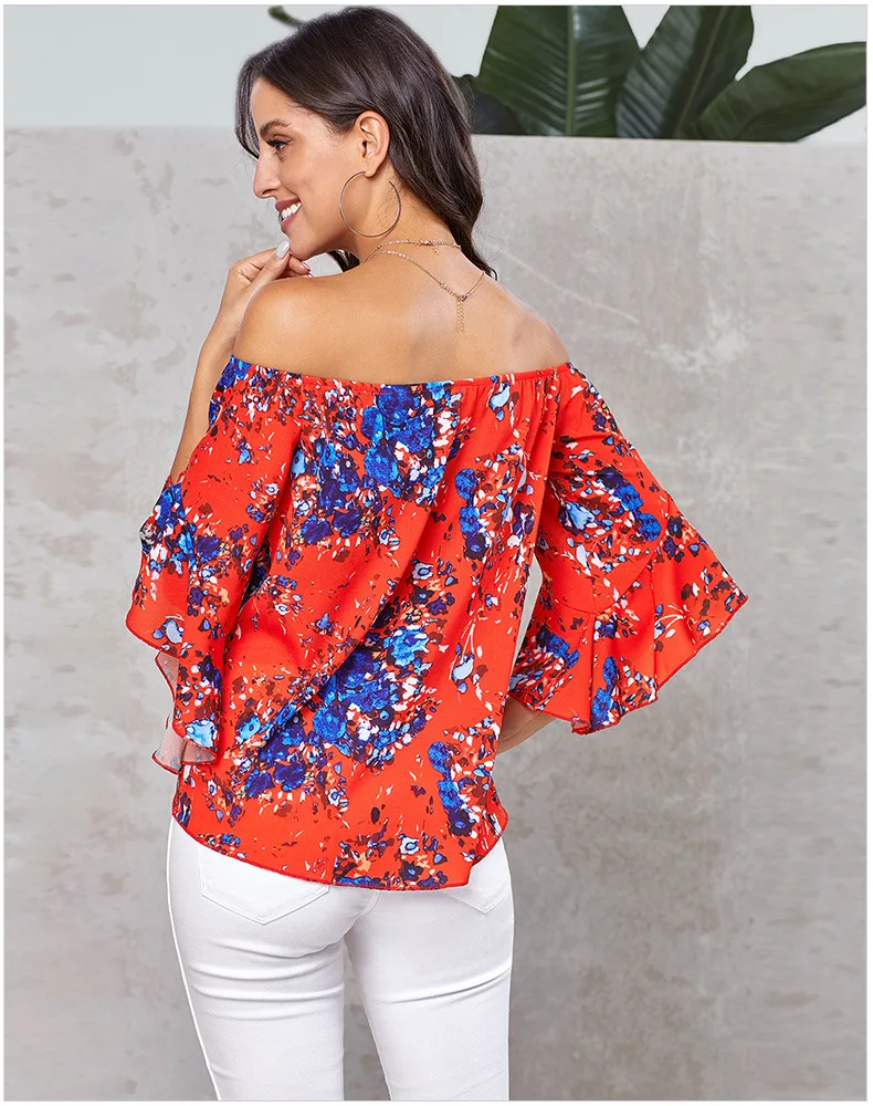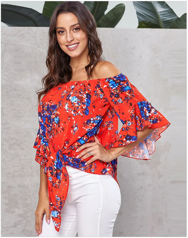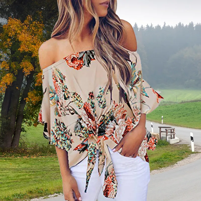Блузка женская с открытыми плечами, пикантная рубашка с цветочным принтом, Повседневная Свободная блузка на шнуровке, размера плюс, на лето