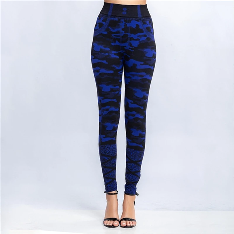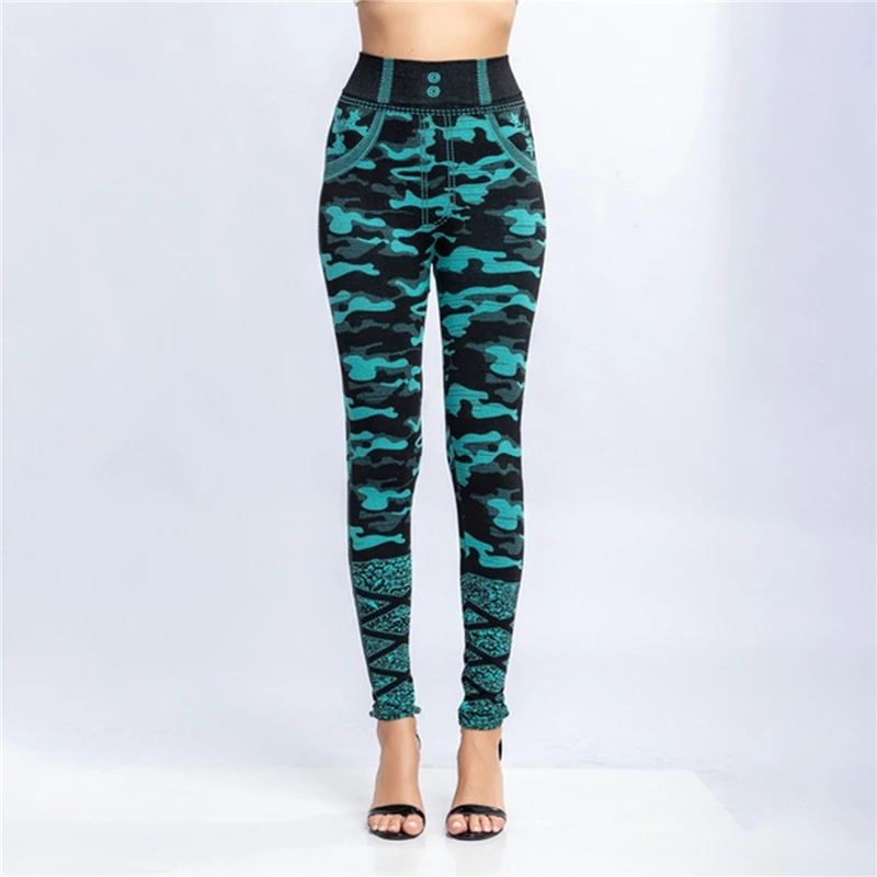 Женские леггинсы с камуфляжным принтом, облегающие эластичные бесшовные леггинсы из искусственного денима с ложным карманом для фитнеса
