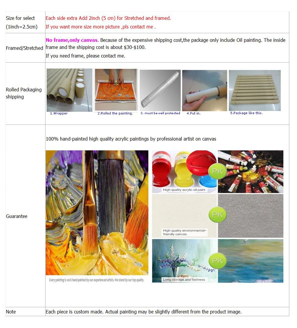 В: Что делать, если я не получил свою покупку? О: если вы не получили покупку, пожалуйста, будьте терпеливы. Ваша покупка может дойти до вас в течение следующих нескольких дней. Между тем, пожалуйста, свяжитесь с транспортной компанией на вашей стороне или свяжитесь с нами для помощи, мы постараемся сделать все возможное, чтобы помочь вам. Если ваша покупка была потеряна, мы отправим вам новую. В: Что делать, если картины, которые я купил, не нравятся? О: пожалуйста, не стесняйтесь обращаться к нам через веб-почту платформы или по электронной почте, мы решим любые проблемы с вами. Мы рады помочь вам обменять остальные, но покупатели несут ответственность за все расходы по доставке. В: почему ваши цены такие низкие? О: у нас много талантливых и мастер-художников, мы приобретаем у них тысячи высококачественных масляных картин напрямую. У нас есть Непревзойденная способность покупать картины по низкой цене и вместо увеличения нашей прибыли мы передаем сбережения нашим клиентам. Покупка у нас дает вам возможность приобрести Масляные картины по оптовой цене. В: как мне это нужно срочно, есть ли у вас ночные способы доставки? О: как правило, мы отправим картины в течение 2-7 дней после подтверждения оплаты, вы можете сообщить нам, если вам это нужно срочно, затем мы постараемся выбрать для вас способ доставки на ночь. Но мы не уверены, что товар будет доставлен вовремя полностью, потому что международная доставка трудно контролировать. В: Можете ли вы сделать индивидуальный рисунок? О: Да, если у вас есть специальный запрос, пожалуйста, свяжитесь с нами. В: Могу ли я получить скидку? О: обычно у нас будет скидка каждые несколько месяцев, вы можете поместить товары, которые вам нравятся, в корзину и Добавить в список желаний, подождите, пока система сообщит вам о скидках. В: вы предлагаете оптовую цену? О: Да, если вы хотите заказать много штук вместе, вы можете связаться с нами, и мы проверим, какую скидку мы можем предложить.