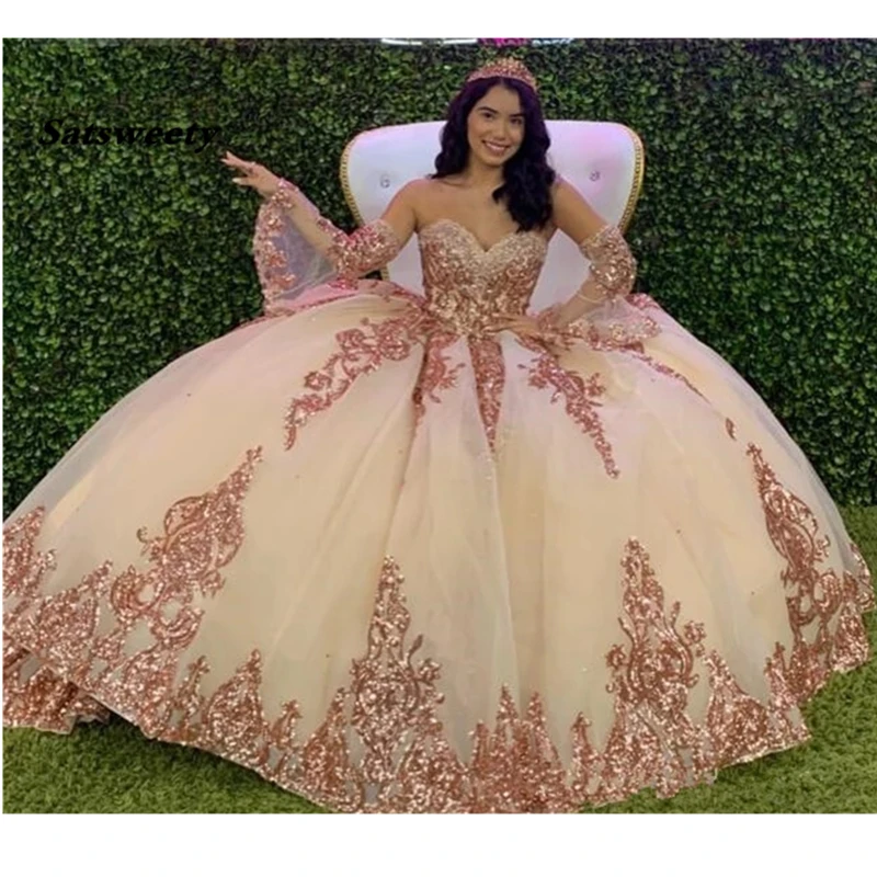 Розовое золото, блестящее бальное платье для выпускного вечера, 2022, современное милое кружевное бальное платье с аппликацией и блестками, Тюлевое винтажное вечернее платье