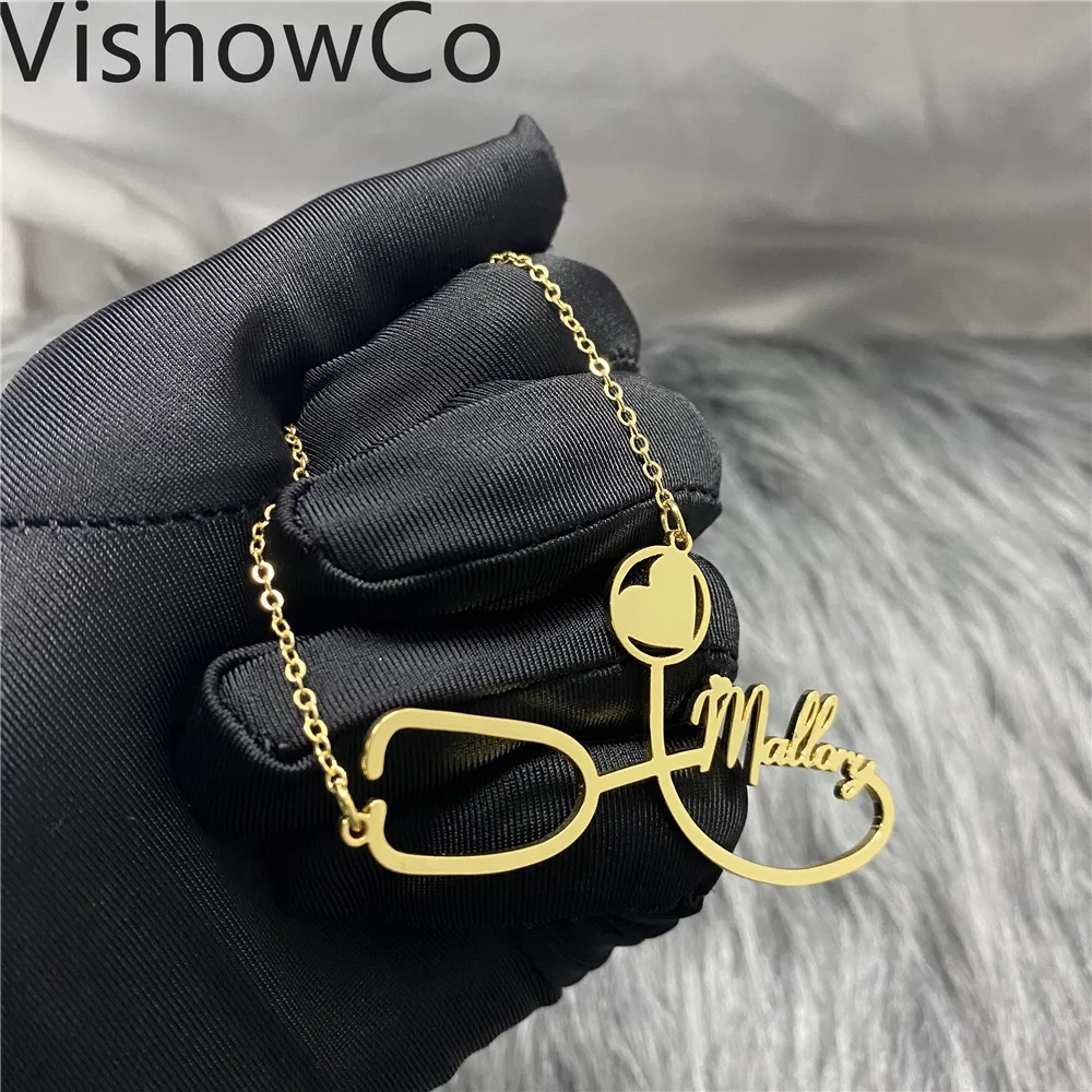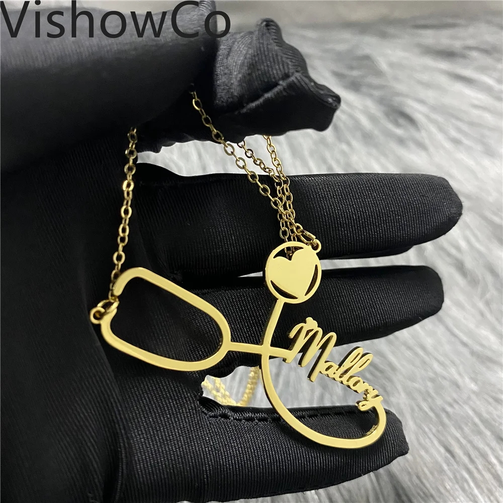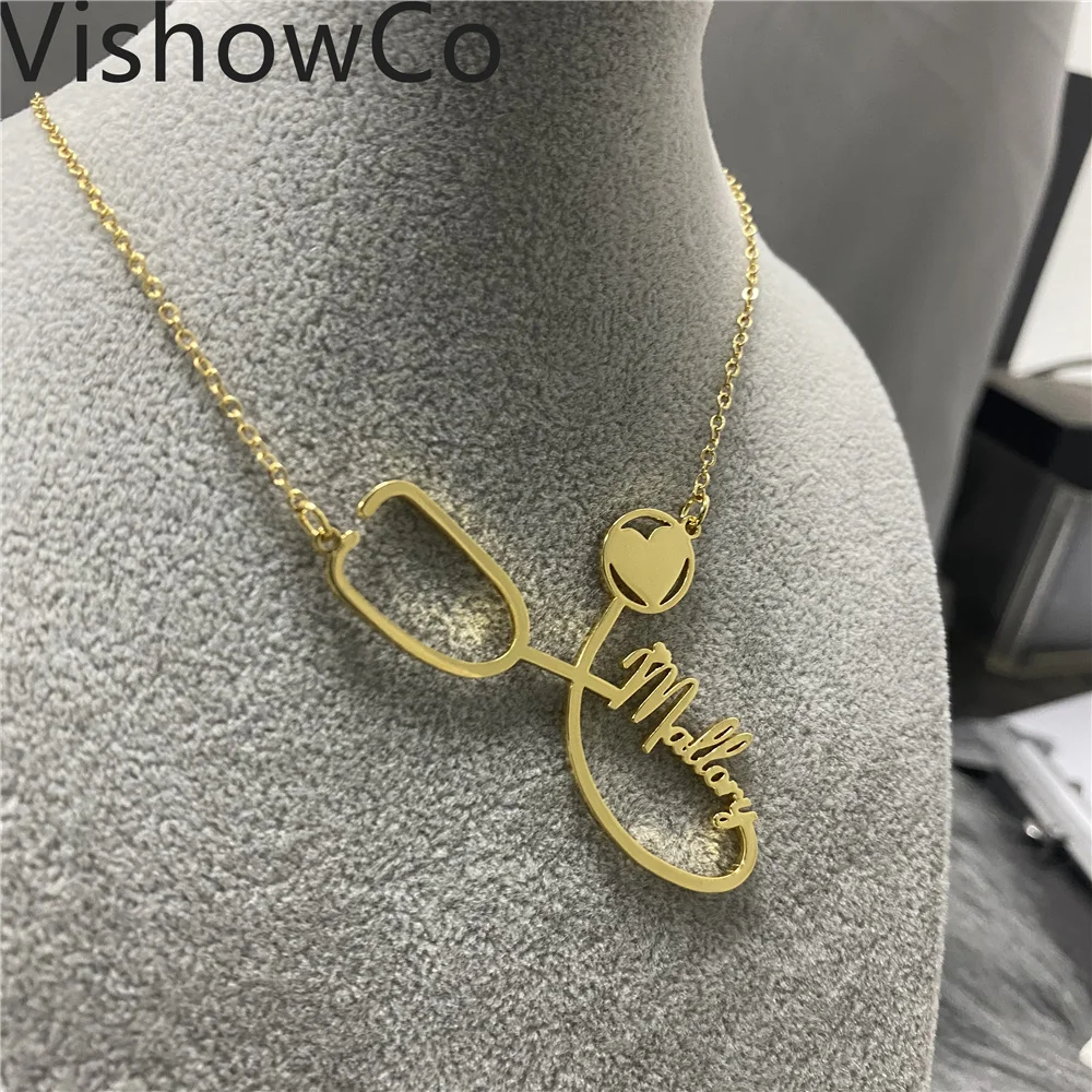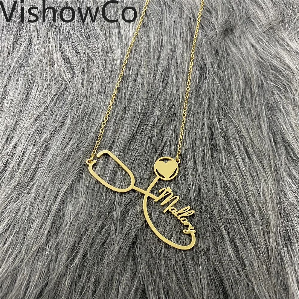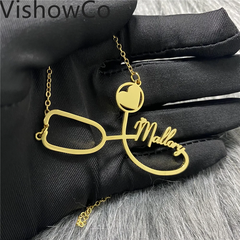 Ожерелье с именем на заказ VishowCo, из нержавеющей стали, подвеска под золото, стетоскоп, именная табличка, ожерелье подарок для врача