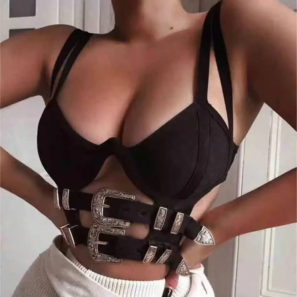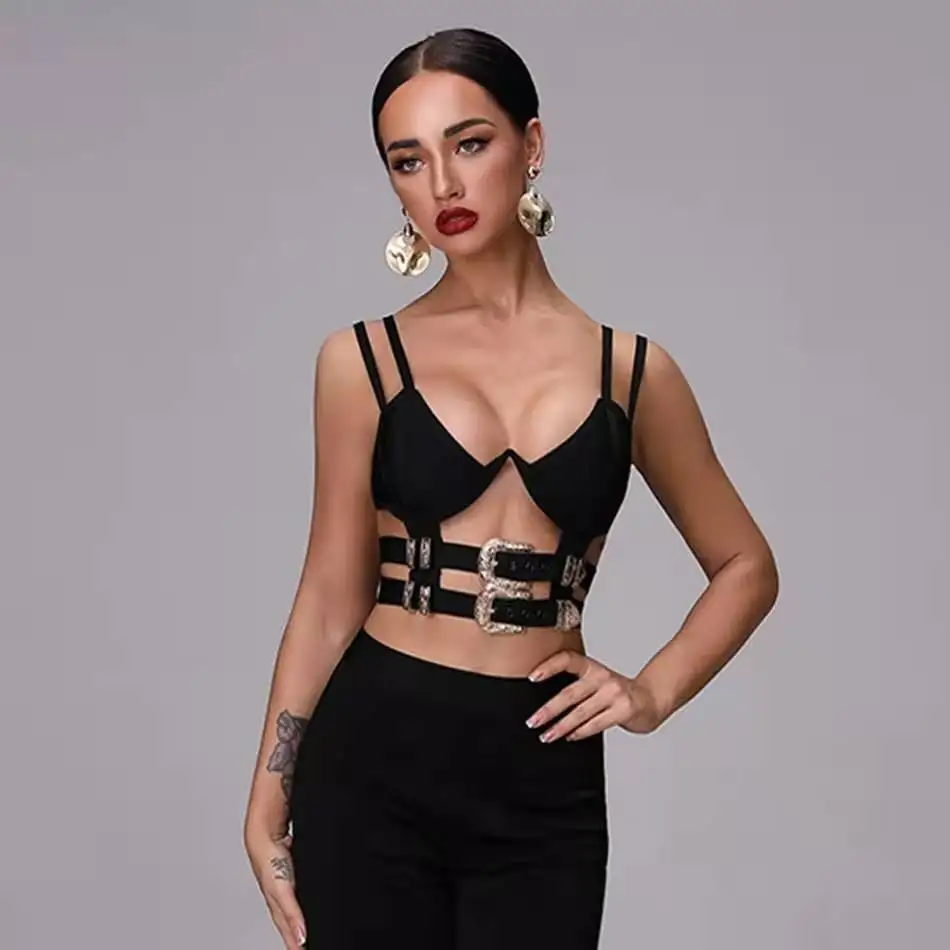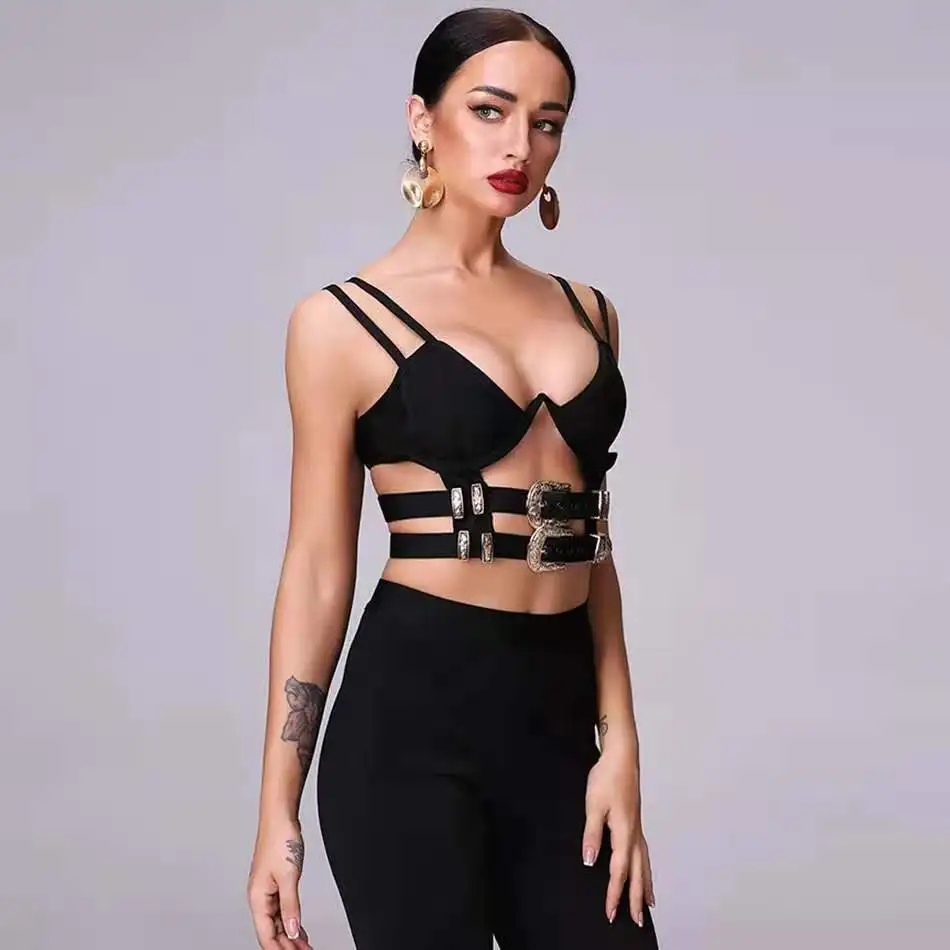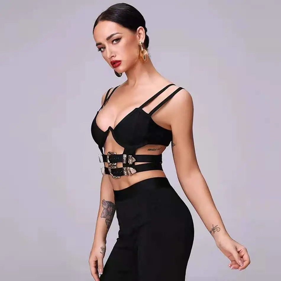 Высококачественные новые женские сексуальные повязки, топы, ажурные без рукавов, металлическая декоративная Черная кофта, топы