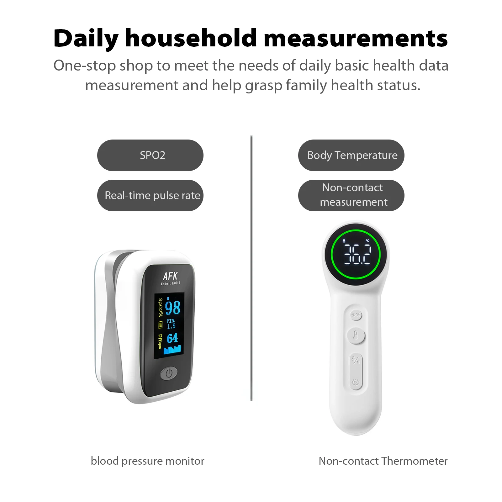 Особенности:О пальцевом пульсоксиметре:Управление одной кнопкой, технология оптического обнаружения, быстрое измерение SpO2 (насыщение крови кислородом) и PR (пульс).Прижмите палец оксиметром, нажмите кнопку управления и SpO2/PR может быть четко отображена с высокой точностью.OLED прозрачный дисплей, 4 направления можно регулировать для удобного чтения.Автоматическое отключение в течение примерно 5 секунд, энергосбережение и экологичность.Мини-оксиметр с ремешком, портативный для дома или путешествий.О инфракрасном термометре:Измерение температуры человеческого тела:Этот инфракрасный термометр для лба подходит для всех возрастов, младенцев, взрослых и пожилых людей, что обеспечивает самый простой и практичный способ измерения температуры.Вспомогательный светильник зонда:Позаботьтесь о сне вашего ребенка и Упростите расположение лба.Бесконтактное измерение:Портативный цифровой инфракрасный термометр Температурный пистолет. Избегайте касания кожи, удобно измеряйте температуру и не подвергайте опасности перекрестной инфекции.Термометр мгновенного чтения:Нажмите кнопку измерения, и результат будет выложен за 1 секунду. Высокая эффективность, не нужно ждать, экономьте ваше время. Дисплей высокой четкости.Трехцветная картина с Предупреждение светильник:Вы можете легко определить, является ли температура тела нормальной в зависимости от цвета дисплея. Зеленая подсветка указывает на нормальную температуру тела, оранжевый-на высокую, красный-на высокую температуру.Широкое применение:Он не только поддерживает лоб людей, но также может случайно получить температуру поверхности объекта. Широко используется на заводе, в офисном здании, в торговом центре или дома.Характеристики:О пальцевом пульсоксиметре:Тип дисплея: oled-дисплейМодель: AFK YK011Диапазон измерения SpO2: 0%-100% (разрешение 1%)Точность SpO2: ± 2% на этапе 70%-100%, не имеет значения на этапе 0%-69%Диапазон измерения PR: 25BPM-250BPM (разрешение 1BPM)Батарея: 2*1,5 V AAA Батарея (не входит в комплект)Потребляемая мощность: ≤ 30 мАРабочее состояние: 15 ℃-40 ℃, ≤ 85% RH, 70 кПа ~ 106 кПаМатериал: АБС-пластикЦвет: синий, серый (по желанию)Товар Размеры: 6*3,5*3,2 см/2,36*1,38 * 1.26inВес изделия: 31 г/1,09 унцийРазмер посылка: 8,3*6,5*3,5 см/3,27*2,56*1,38 дюймовПосылка Вес: 58 г/2,05 ozО инфракрасном термометре:Характеристики:Название продукта: инфракрасный термометрМодель: IR988Цвет: белыйМатериал: пластикРежим измерения: БесконтактныйМесто измерения: лобРасстояние измерения: 2-5 смДиапазон измерения тела: 34,5 ℃-42,5 ℃ (94,1 ℉-108,5 ℃)Макс допустимая погрешность: ± 0,2 ℃(35-42,0 ℃), ± 0,3 ℃ (34,5-34,9 ℃), ± 0,3 ℃ (42,1-42,5 ℃)Единица измерения: ℃ / ℉Подсветка: Зеленый: 34,5-37,5 ℃; Orange: 37,6-38,5 ℃; Красный: 38,6-42,5 ℃Источник питания: 3 В постоянного тока, 2 * батарейки типа "ААА" (не входит в комплект)Размер изделия: 152*55*46 ммРазмер цветной коробки: 170 мм * 90 мм * 55 ммВес посылка: 122 гПосылка:1 * Пульсоксиметр пальцевого наконечника1 * ремешок1 * Инфракрасный термометр1 * сумка для хранения1 * Руководство пользователя (на английском языке)