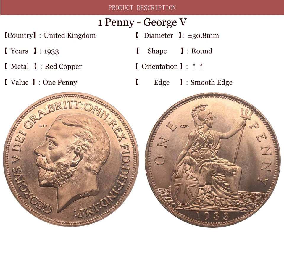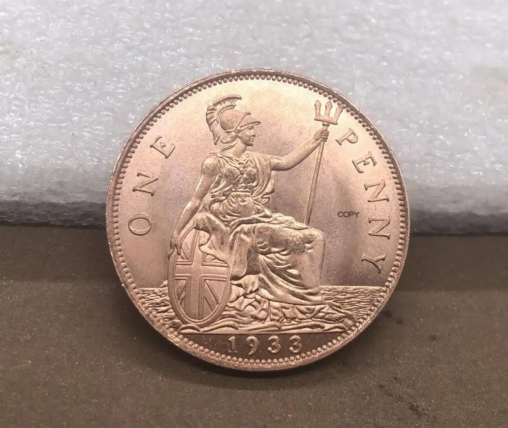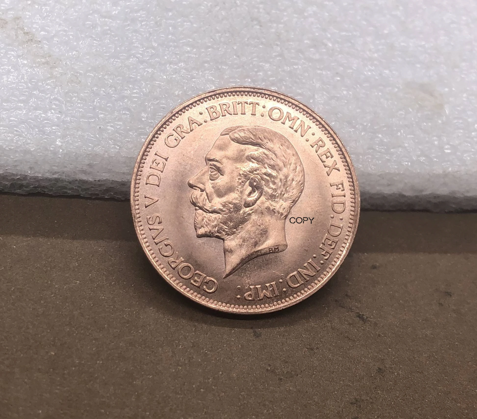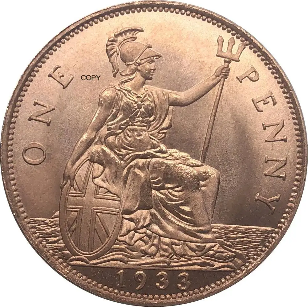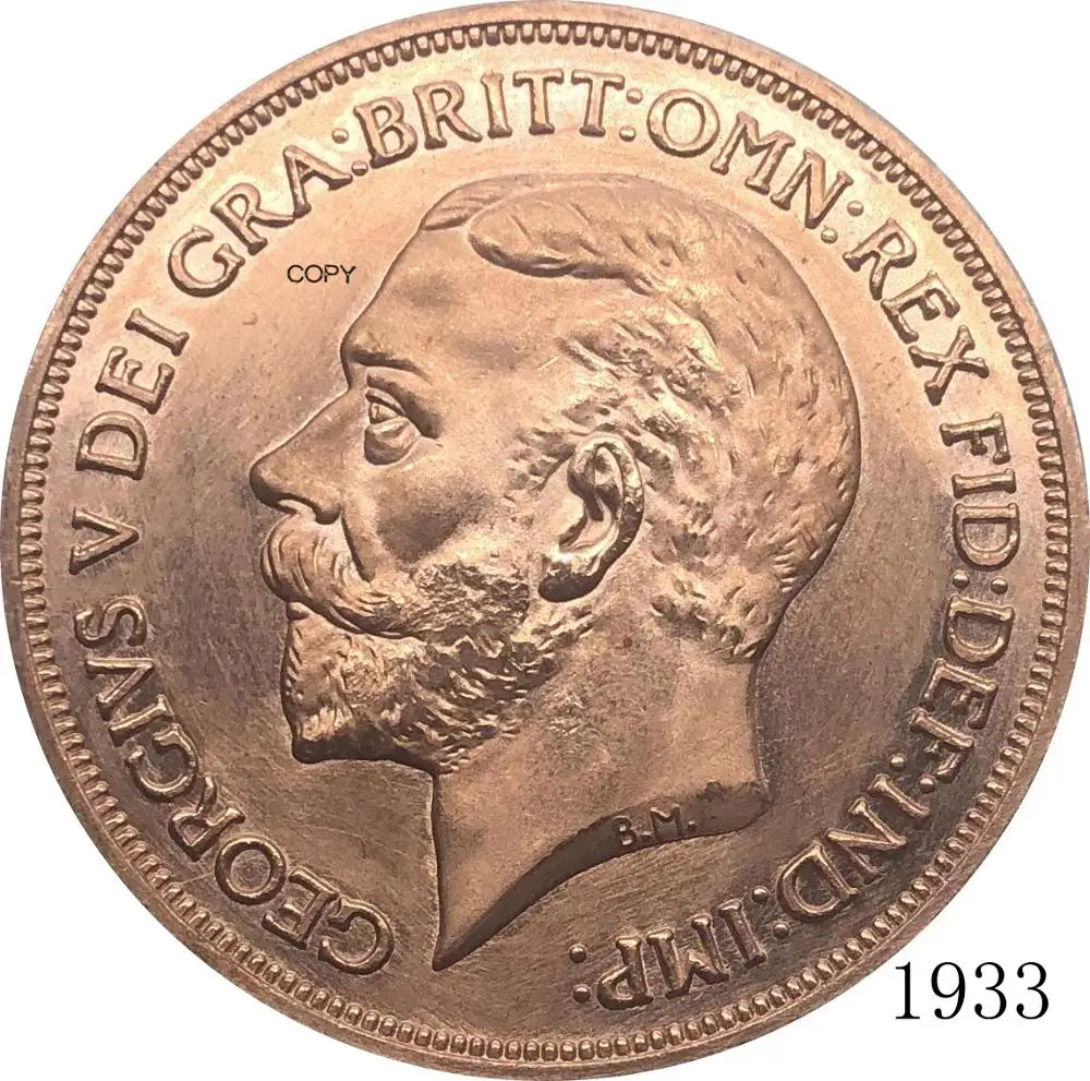 Коллекция 1933 года, портрет короля Джорджа V, 1 пенни, Великобритания, копия монеты из бронзы, красной меди с гладким краем