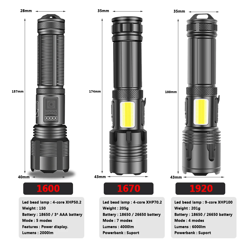 МодельСветодиодные бусиныВесРазмерЛюменыРежим переключенияВнешний аккумуляторАккумулятор1600XHP50.2150 г157*40*28 мм2000 лм5 режимовНет186501670XHP70.2 + COB205 г174*43*35 мм4000лм7 режимовДа18650/266501920XHP100 + COB201 г180*43*35 мм6000lm7 режимовДа18650/26650