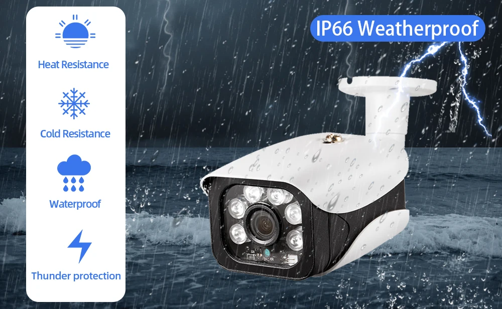 Используйте их в качестве наружных камер или крытых камер, так как они построены жестко, выдерживает любую погоду: дождь, снег, пыль и жаркие дни. С защитой от атмосферных воздействий IP66 и кабелями, просвечивающимися через подставку для защиты, гарантируем, что вы сможете ответить на их производительность, день в день. Наша камера имеет сверхпрочный металлический корпус, профессиональный IP66, устойчивый к атмосферным воздействиям, обеспечивая стабильную производительность как внутри, так и снаружи.