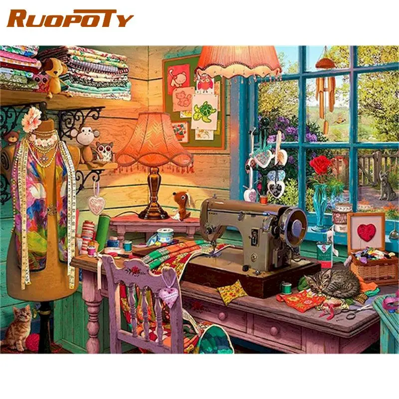 RUOPOTY краска по номерам 40x50 см рамка швейная машина пейзаж масляная краска Хан краска ed рисование на холсте современное домашнее искусство